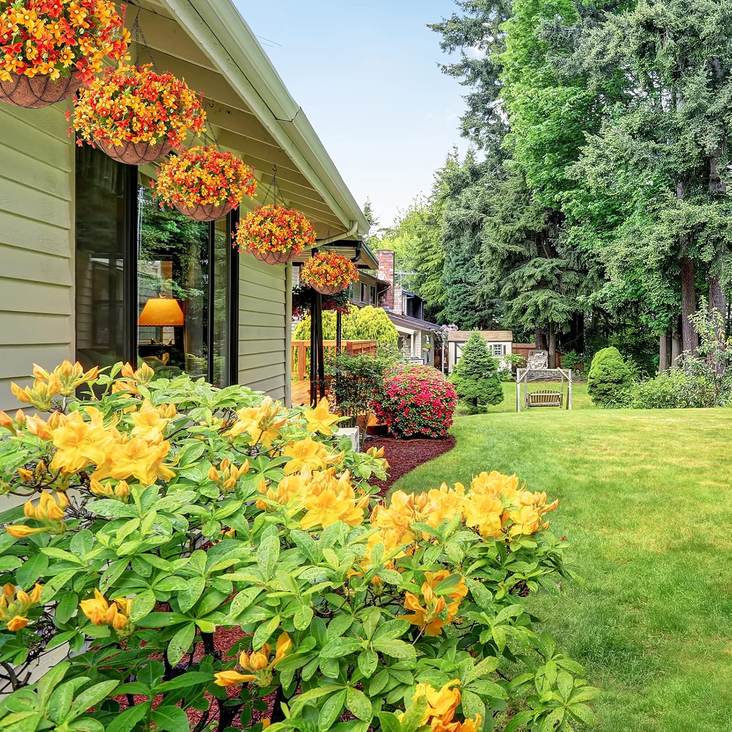 - Decoration Anywhere: Well-made fake hanging flower basket can beautify any place. Decorate the hallway, balcony, study, home, yard, garden, office, whatever you want. Beautiful artificial flowers to add color to your life.