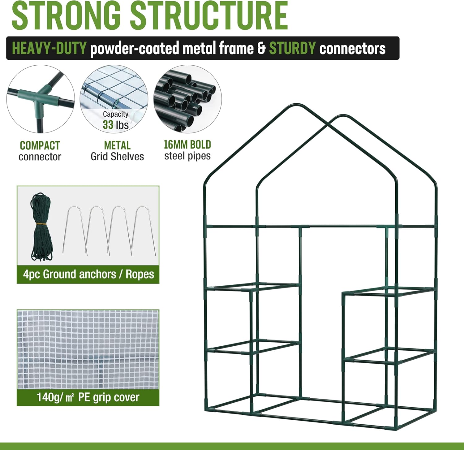 - Strong Structure: Green houses for outside heavy duty built with heavy-duty powder-coated metal frame and reinforced thick (140g/㎡) water-proof PE cover. Two bearing shelves on each side are enough to hold more seed trays, pots, and plants. There are straps at the four corners to attach to the frame to enhance stability. Additionally, the reinforced PE cover of the greenhouse cabinet is stronger and thicker than standard PVC to reinforce the frame while promoting healthy plant growth.