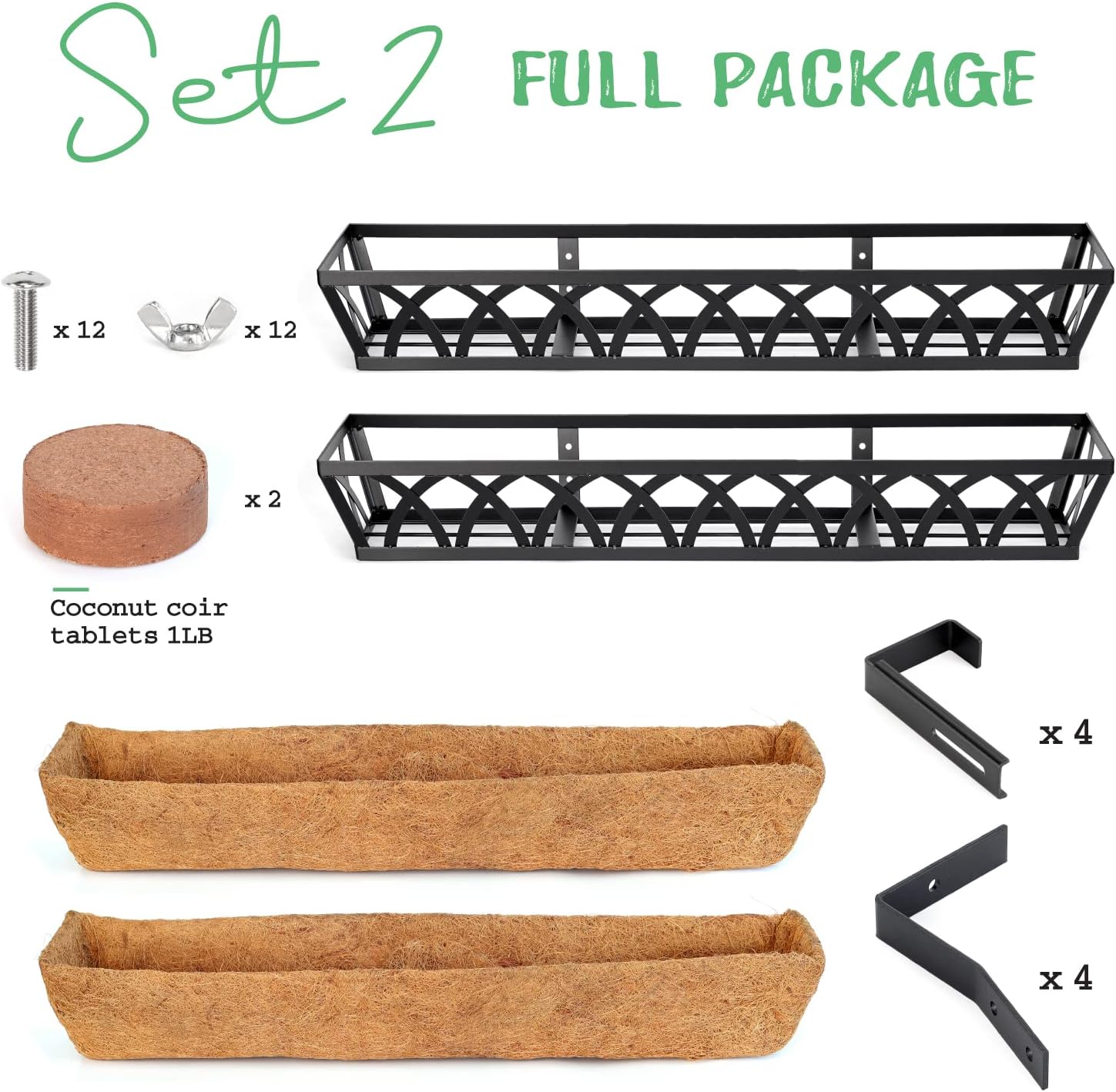 Window Box Railing, 24 Inch Black Metal Hanging Flower Planter Basket with Coco Liner for Outdoor Balcony Porch Fence Patio for Home, Office and Hotel (Black - 2 Pcs/Set)