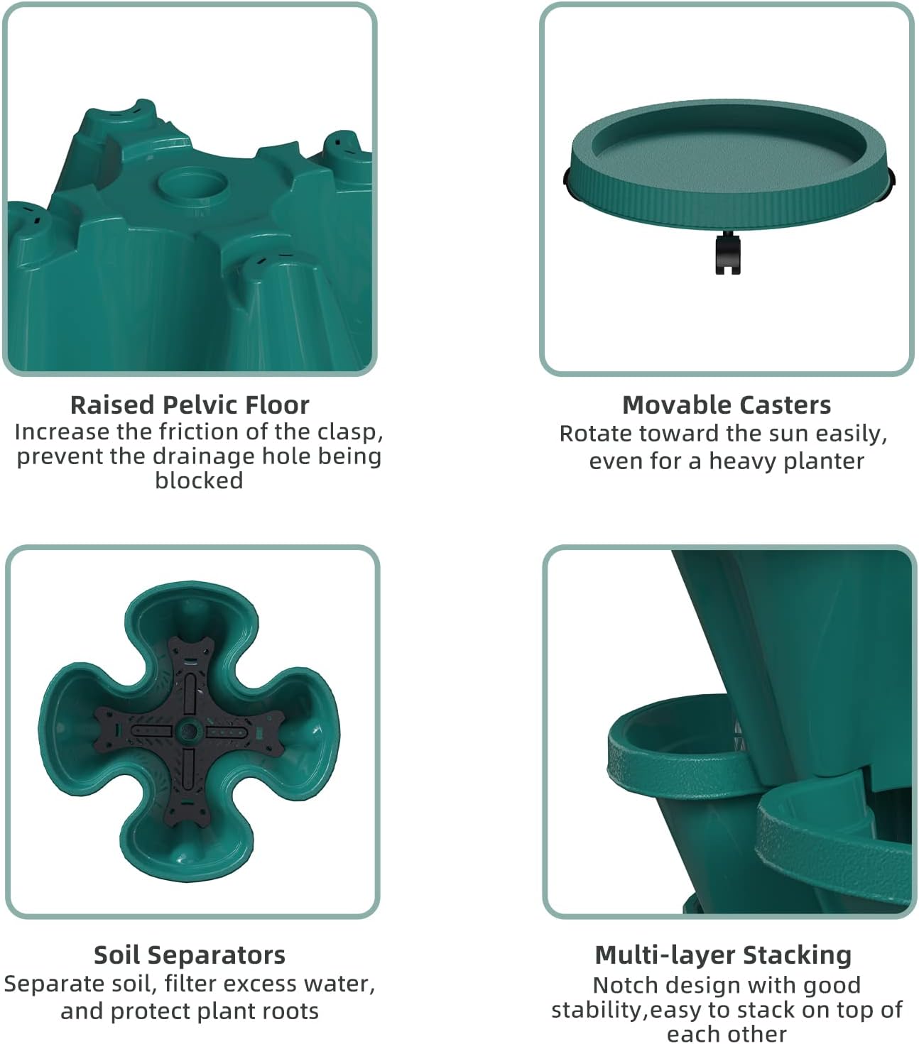 Strawberry Stacking Planters, Vertical Garden Tower, 3 Tiered Stackable Herb Vegetable Planters with Movable Casters and Bottom Saucer Indoor and Outdoor - Hunter Green