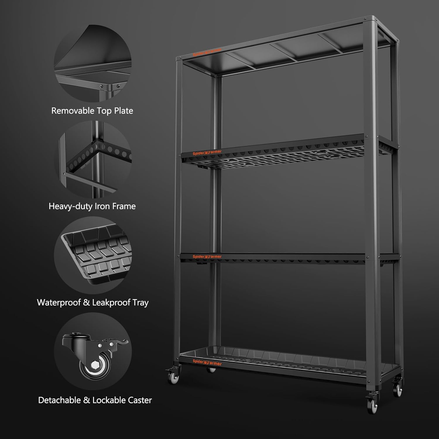 - 𝐄𝐚𝐬𝐲 𝐭𝐨 𝐀𝐬𝐬𝐞𝐦𝐛𝐥𝐞 & 𝐌𝐨𝐯𝐞: Designed for quick setup, the Spider Farmer plant stand can be assembled in 20 minutes using the included Allen wrench and stainless steel screws. It features four lockable caster wheels made from durable polyurethane, offering smooth mobility, shock absorption, and floor protection. Move the stand effortlessly to adjust for seasonal changes or lighting conditions, then lock the wheels in place for stability.