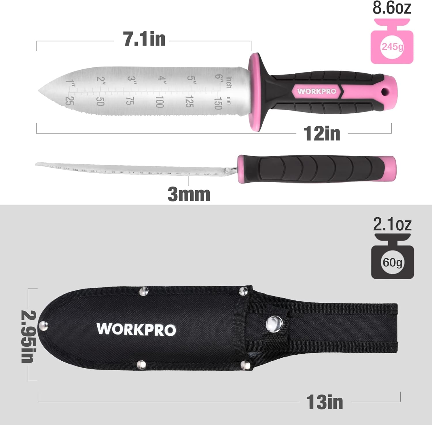 WORKPRO Hori Hori Garden Knife, 7" Stainless Steel Blade with Cutting Edge, Garden Tools with Oxford Sheath, Ergonomic TRP Handle with Hanging Hole for Weeding, Planting, Digging, Pink