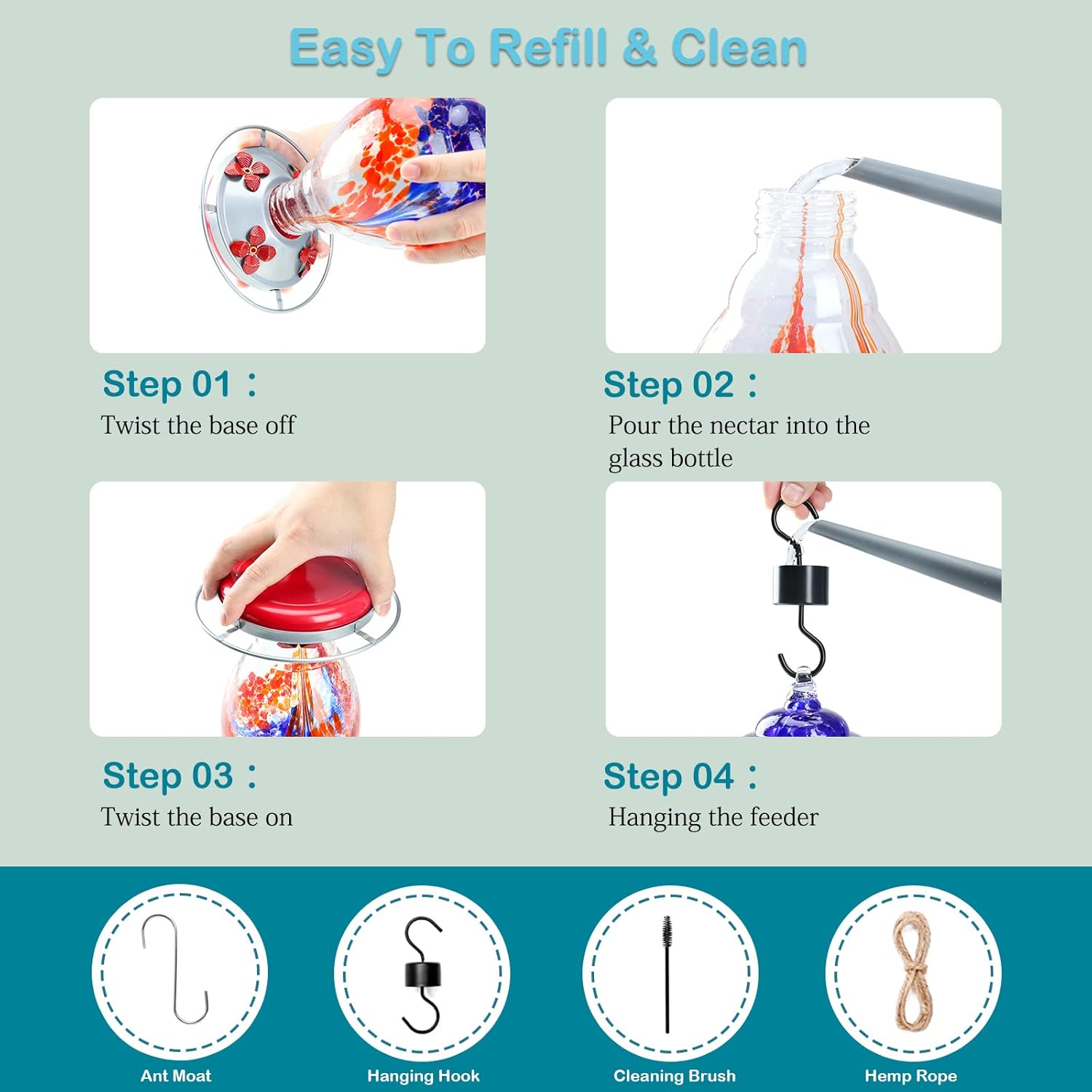 - Convenient to Fill and Clean: With a wide mouth opening design and simple structure, it’s very easy to refill nectar; also convenient to clean with a bottle brush