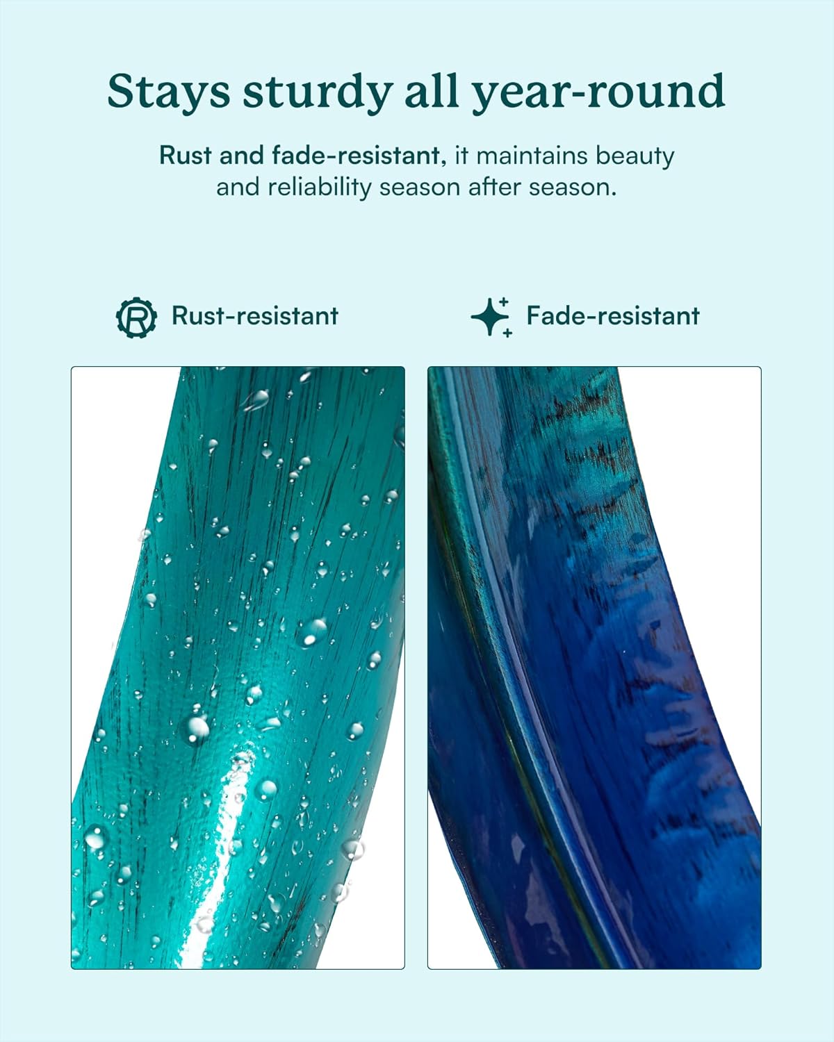 - RESISTANT OUTDOOR METAL DECOR: Made of resistant metal with protective coating finishes. UV, RUST, and FADE RESISTANT. The all-season decorative spinner can be cleaned easily to keep its reflective shine and rustic appearance. Long-lasting use