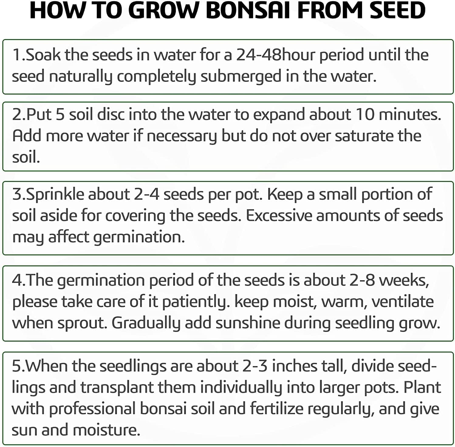 - TIPS FOR BETTER GERMINATION: (1) Dust a thin layer of soil on and keep warm and breathable. (2) The germination period could be 2-8 weeks, please be patient. (3) Detailed manual booklet helps you grow bonsai trees in a more scientific way.