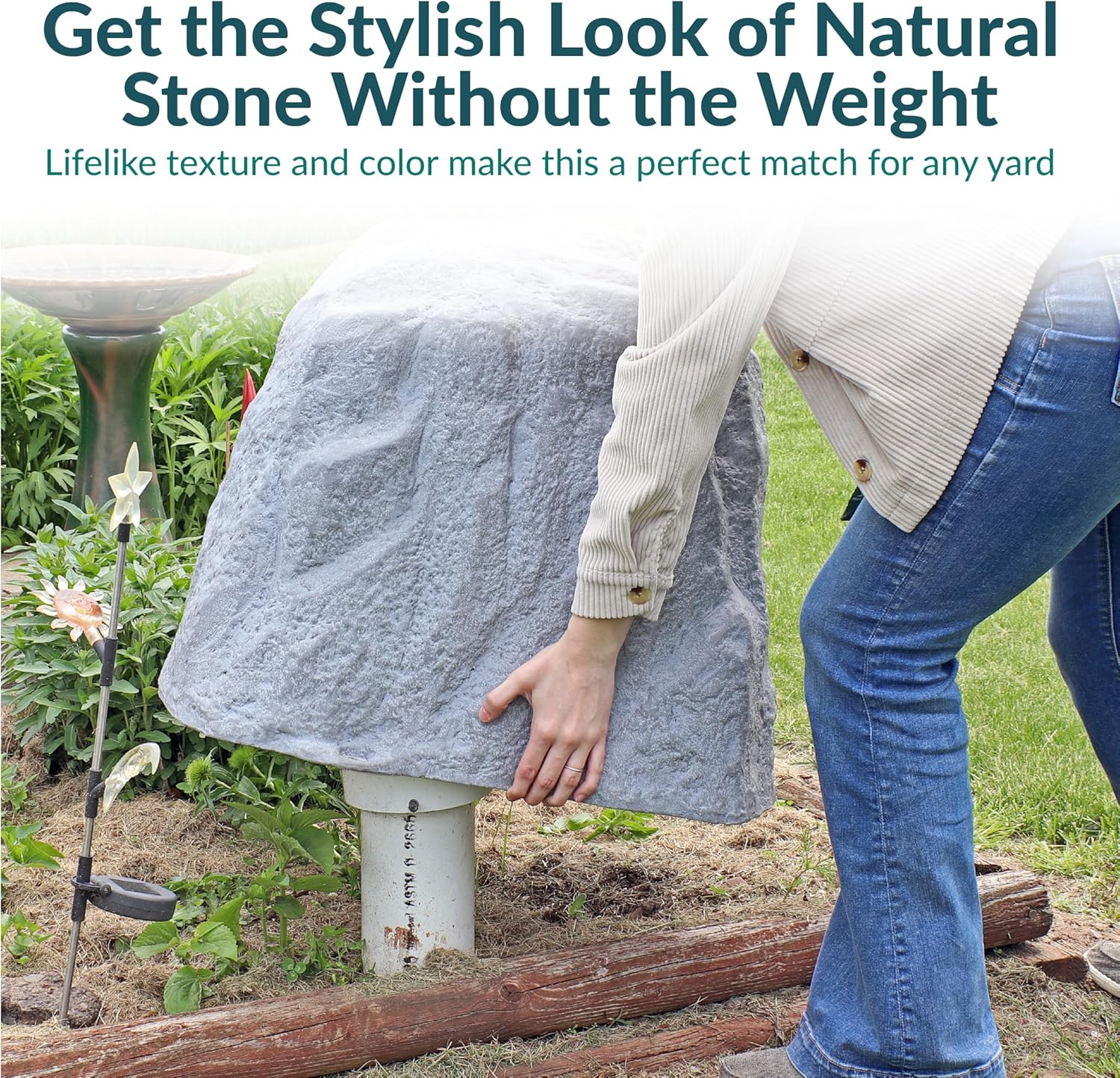 - CONCEALS LANDSCAPE UTILITIES: Place this fake rock cover over a septic tank, well, sprinkler valve, pipe, or other unsightly objects in the yard. Push the stakes into the ground through the holes at the bottom of the rock to secure it over any object.