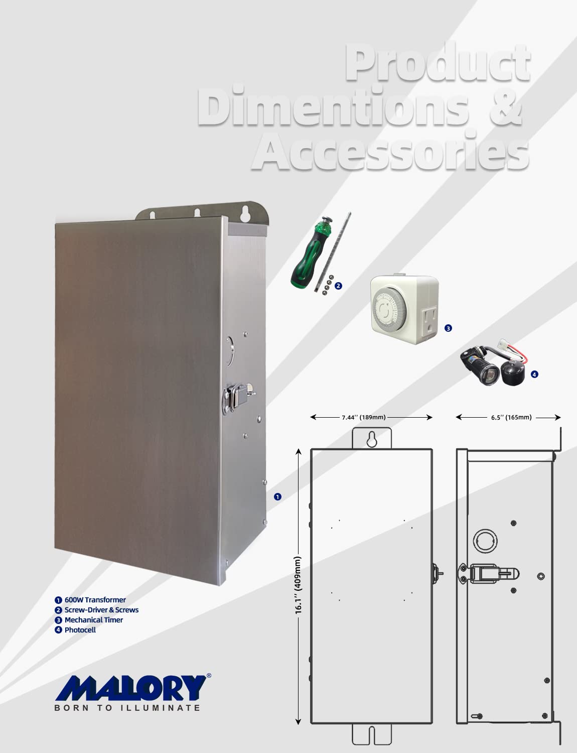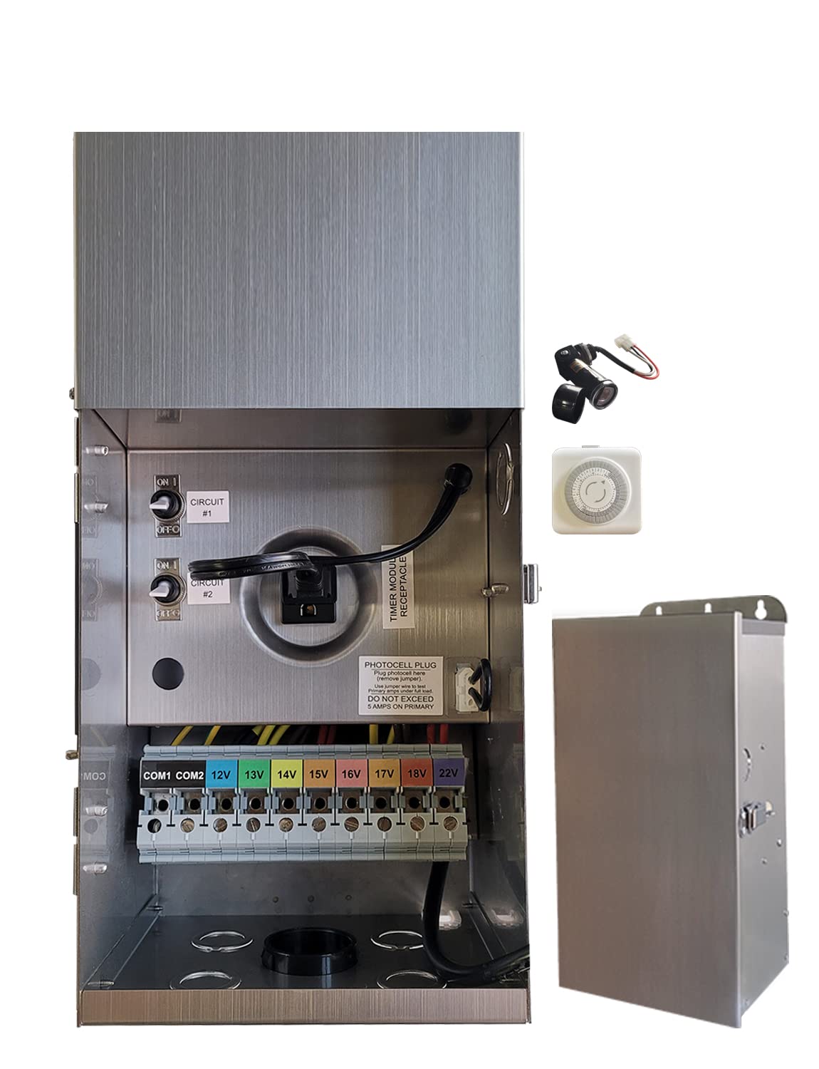 - 16 inch Work with Timer & Sensor:Timer & photocell port available,packge with mechanical timer and photocell sensor for sensing and timing functions. You also can connect the transformer in your smart plug remote control it.The transformer size is 16*7*6inch and weight is 24LB.