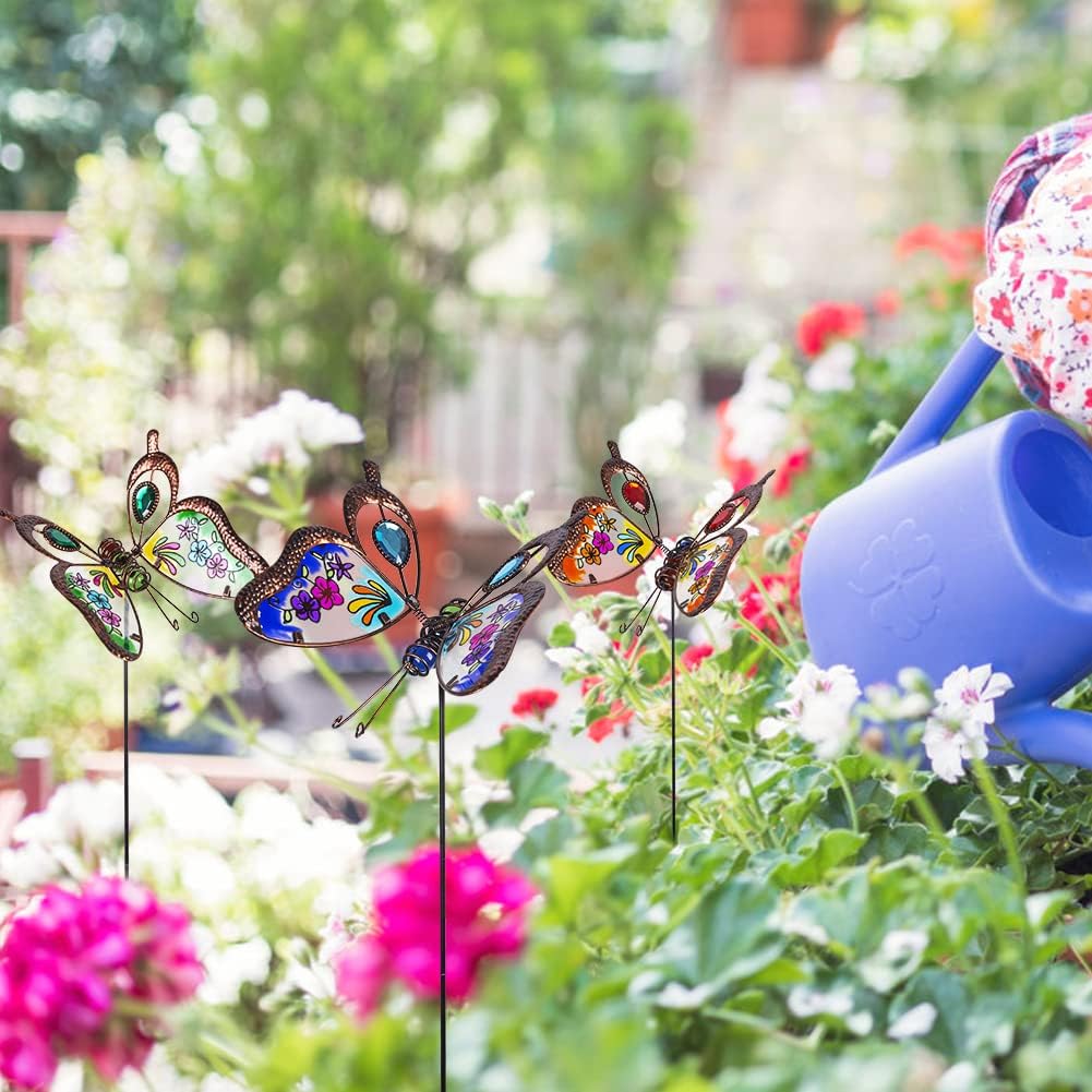 - Garden Stakes Decor:3 pack of butterfly garden stake decorations in different colors, made of advanced rust resistant metal and stained glass. Put butterfly decor in your garden, yard, or wherever you want them to be, they will give you a fresher and more natural feeling