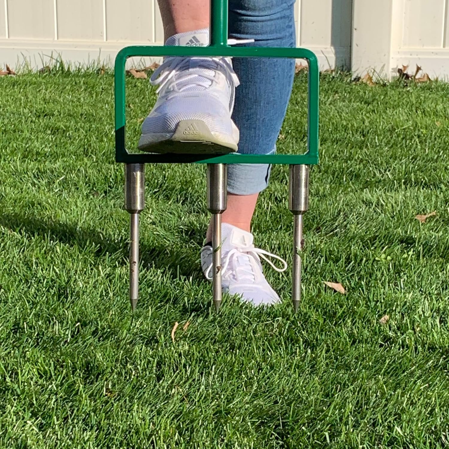 - INNOVATIVE SOLID SPIKE TINES: Landzie's innovative solid spike tines are designed to revolutionize lawn aeration. The three solid, stainless steel spike tines penetrate deep into the ground without removing plugs of soil, making the core aerator lawn tool more efficient at aerating hard, dry soil, making it a faster, more effective lawn aerator tool. The spike tine fork aerator can reach tight corners and edges, providing complete coverage for your lawn.