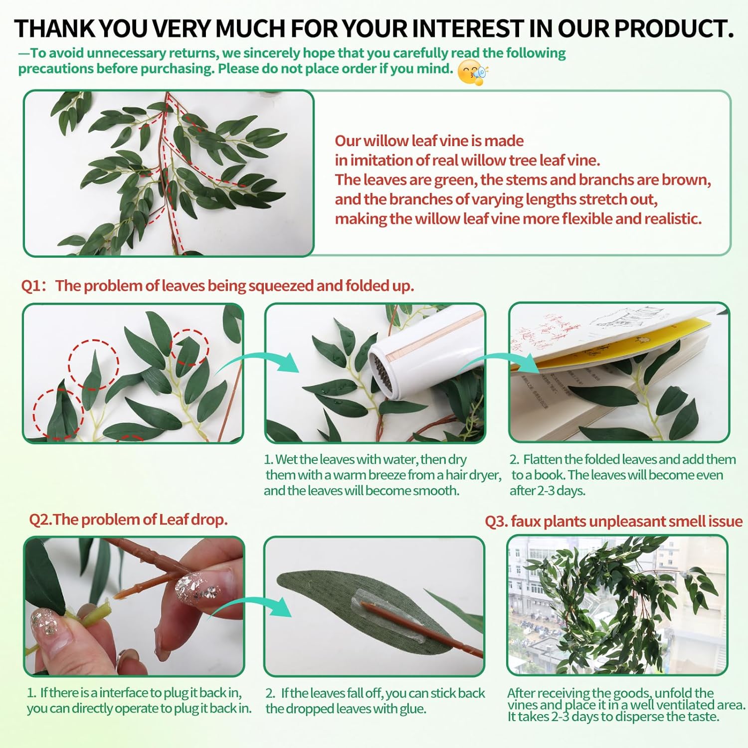 - Our After-Sales Service: It is normal to receive enchanted willow vine with a slight odor, you can leave silk greenery garland in a ventilated environment for 1 or 2 days and it will smell better! If you are not completely satisfied with your product, please let us know how we can make it better. Tips:The product as actually measured, Please allow for an error of 1-2 cm.Due to differences in electronic device display, please allow for slight color differences in the product