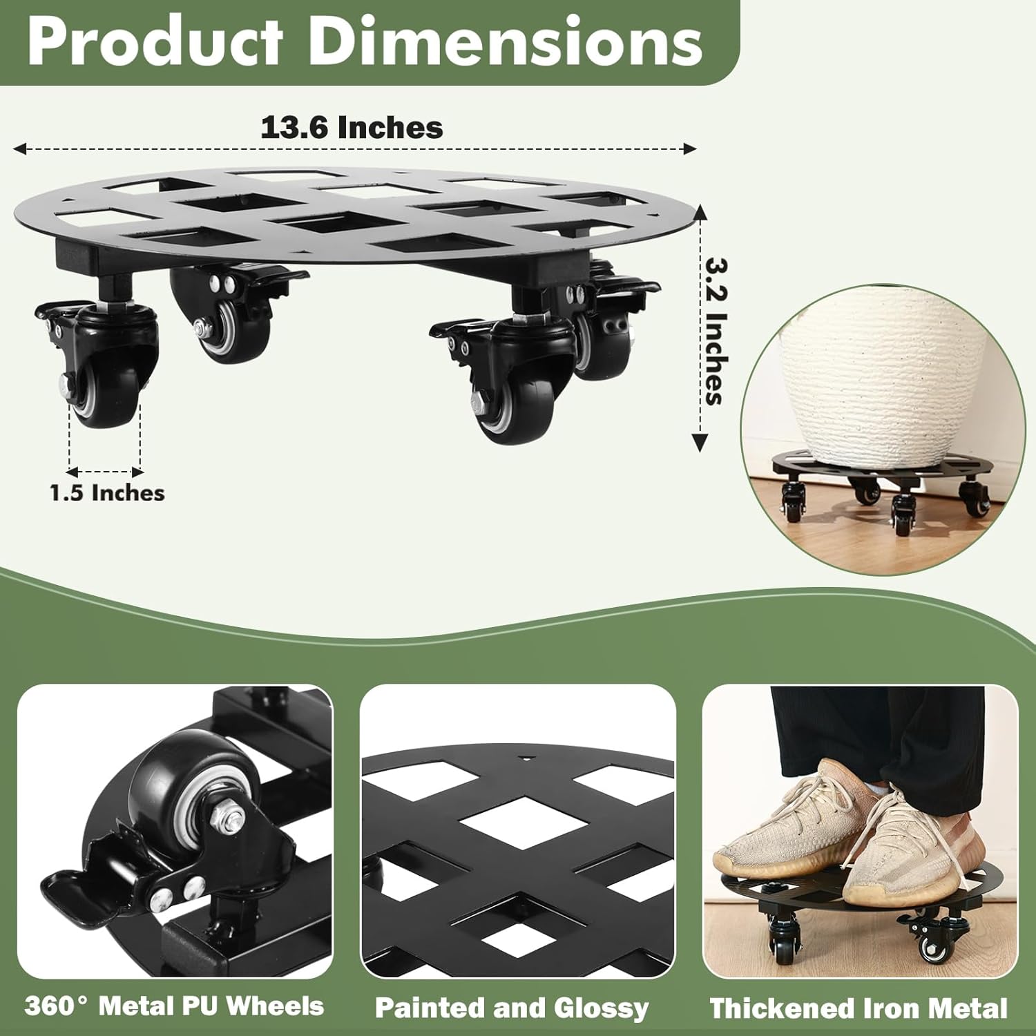 - Metal Construction & Super Strong Load Capacity: Four metal PU wheels for both 13.6" and 12" rolling metal plant caddy; these wheels are well painted and anti-rust. They're made from heavy-duty iron materials and strong enough to load up to 280 lbs. You can roll large, heavy plant pots around the rooms and the outdoors for easy watering. Easily to roll out into the sunlight and back to protected space!
