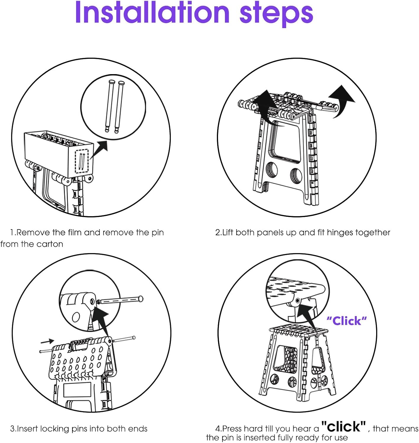 - Tip: If you receive the collapsible step stool and find that there is no pin, you can contact us and we will help you to send you a replacement pin. We provide three months after-sales service, if you have problems, please feel free to contact us.