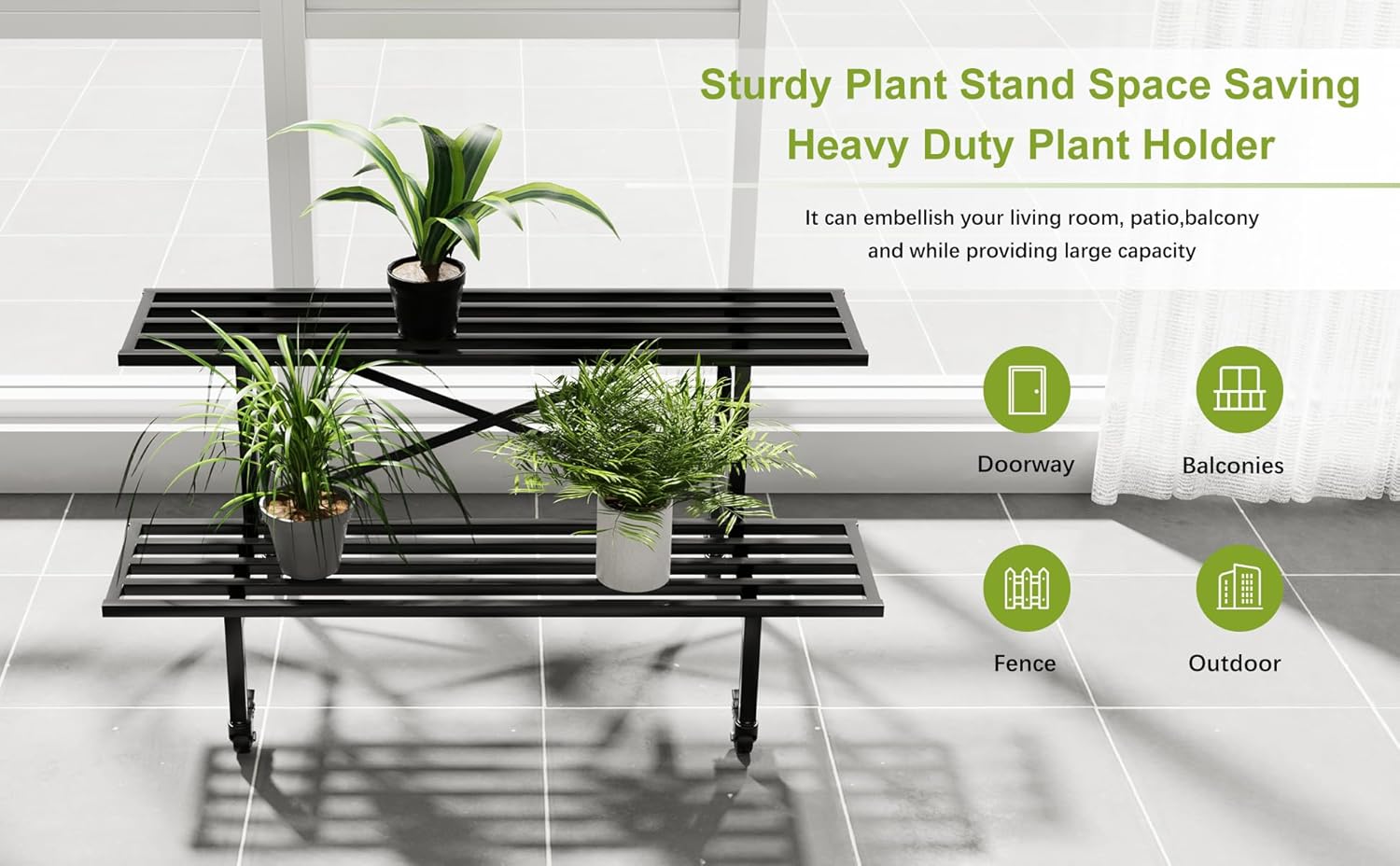 Zhongma 2 Tier Sturdy Metal Plant Stand with Wheels, L35.43 x W17.5 x H16.14 inch, Heavy Duty Plant Holder for Home Indoor and Outdoor,440 LBS Capacity & Heavy Duty Construction
