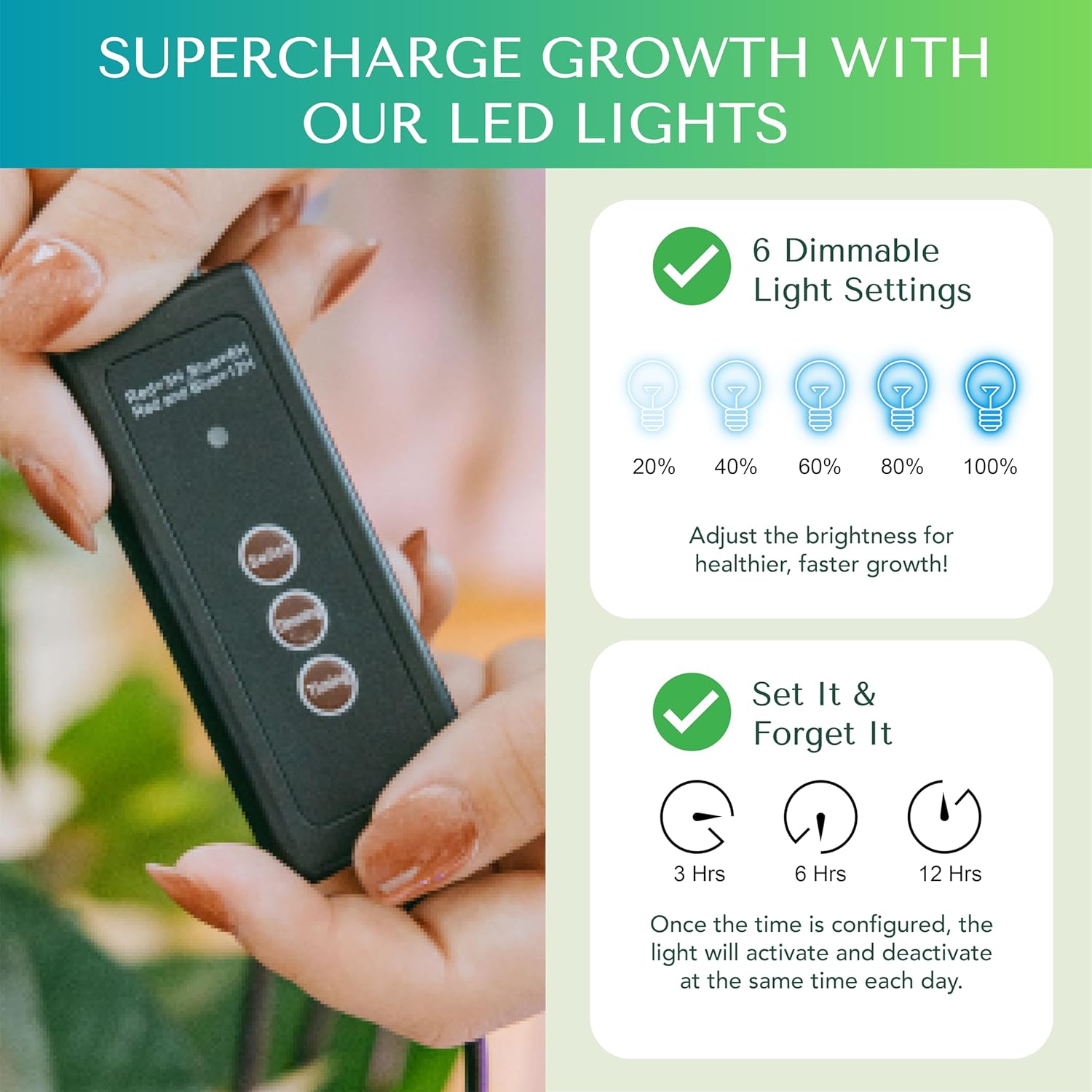 - [LED Grow Lights for Seed Starting & Stronger Seedlings] Boost plant growth with our powerful LED grow lights, featuring 16 white and 4 blue LEDs to replicate natural sunlight for optimal germination and seedling strength. The white LEDs encourage healthy seedling development, while the blue LEDs strengthen root systems for improved survival rates. With adjustable brightness settings, you can customize the lighting for microgreens, vegetables, flowers, and herbs at any growth stage, ensuring faster and healthier indoor plant growth.