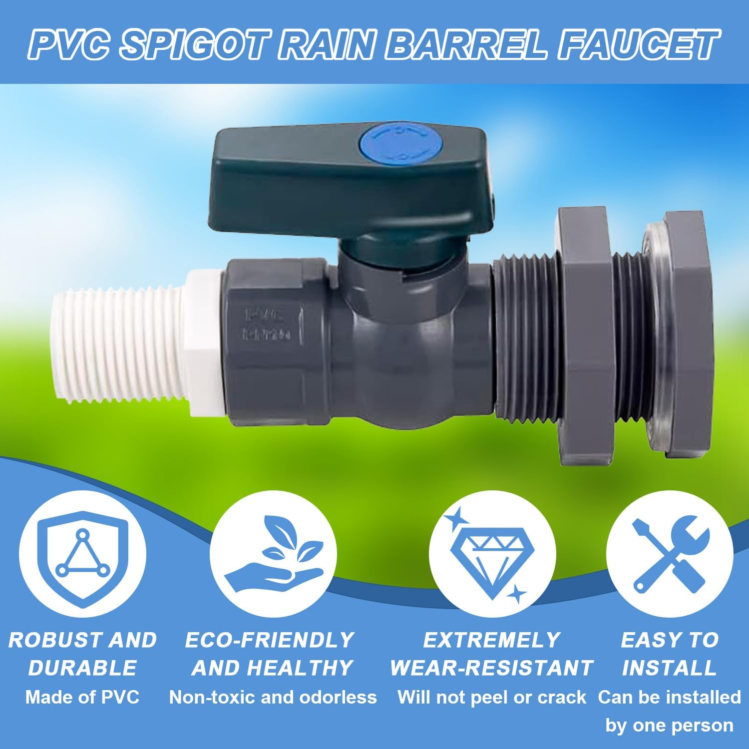 - Set: This rain barrel faucet kit includes a 3/4-inch GHT PVC ball valve, a 3/4-inch heavy-duty plastic assembly, a straight connector, and thread sealing tape for seamless connection to a garden hose.