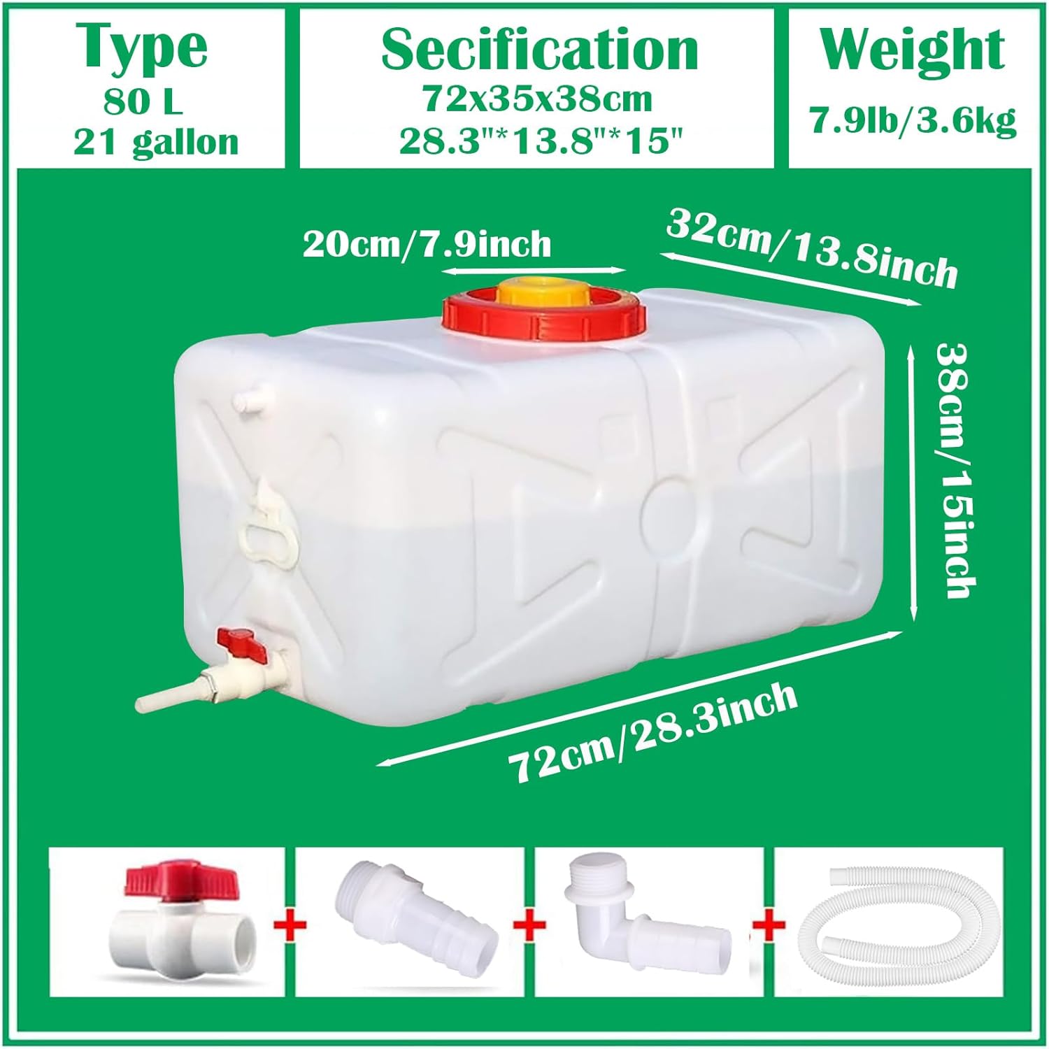 - Large Water Jug - Overall size: 28.3x13.8x15inches/72x35x38cm. Net weight:7.9lb/3.6kg. Large capacity: 80L/21 gallon