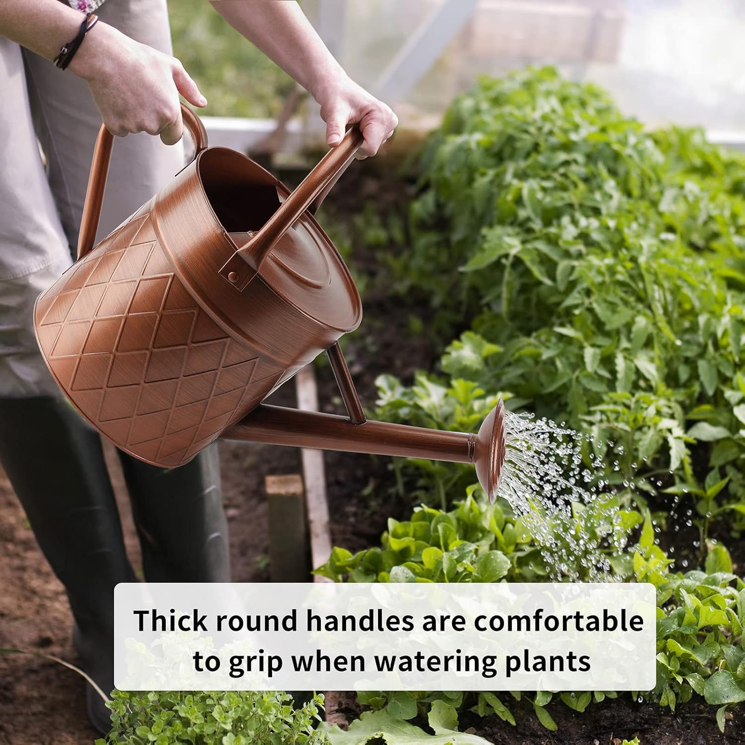 - The unique diamond pattern design on the surface adds a touch of personality and character to the watering can. It not only serves as a practical tool for watering plants, but also doubles as a decorative item for your garden or indoor plants.