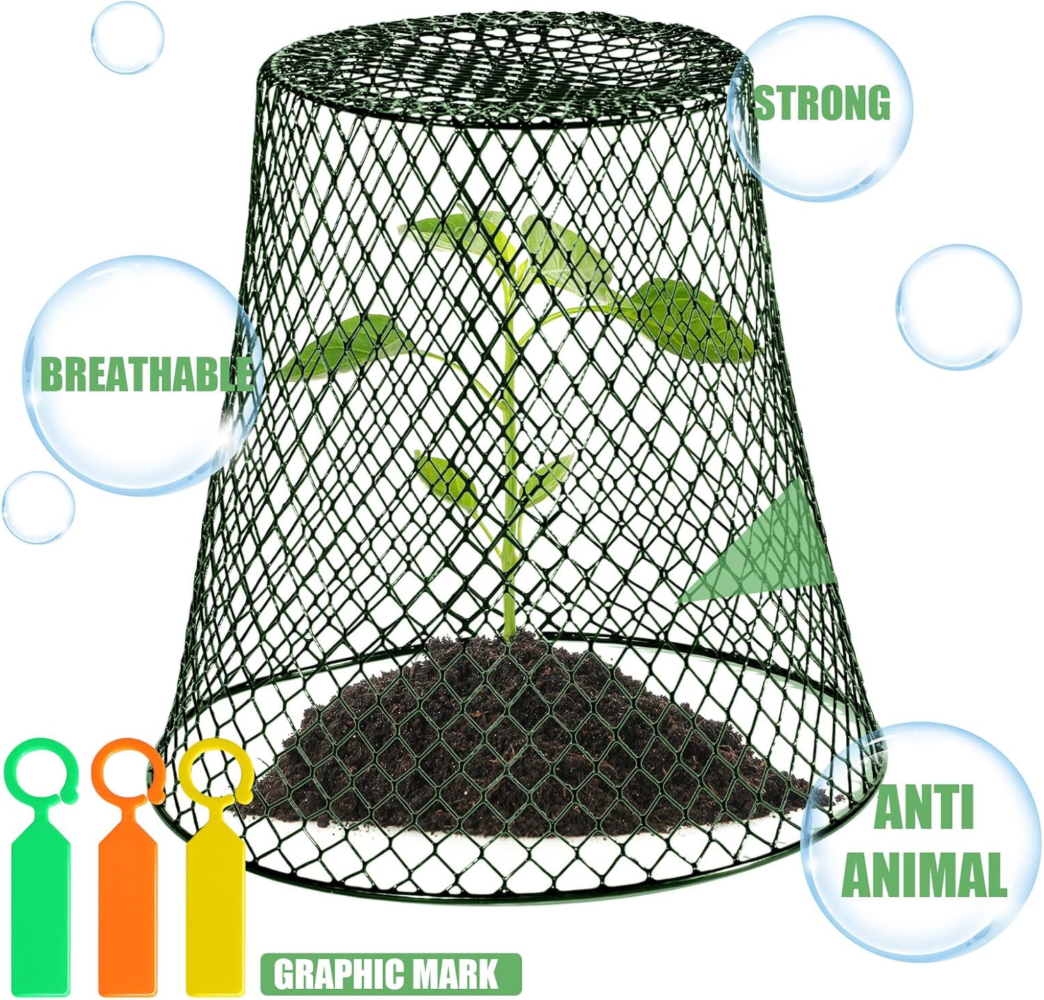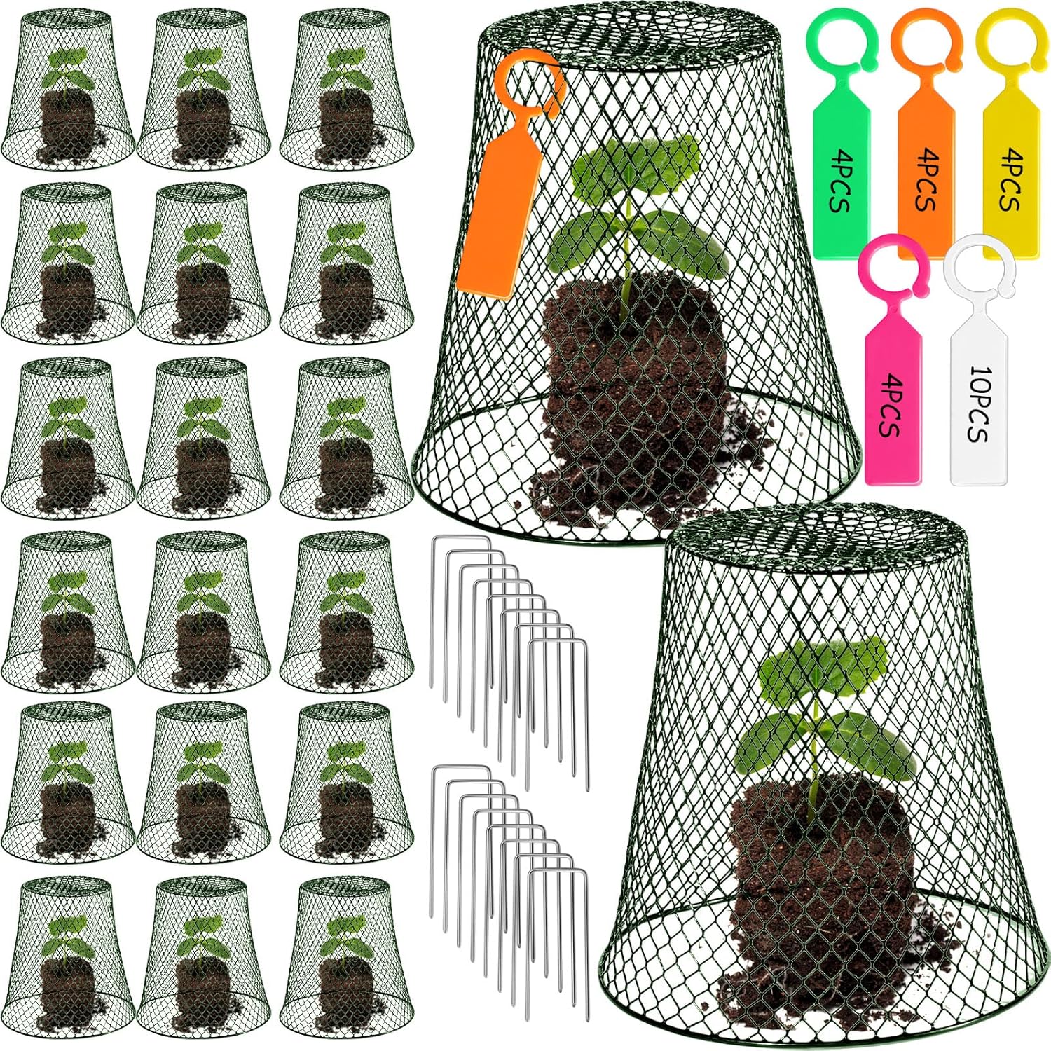- large quantity:you will receive 20 pieces plant protectors, 60 fixing pins, 20 white labels and 20 color labels,enough green chicken wire protection basket to provide security for your products and guard the fruits of your labor with our all season plant barrier.