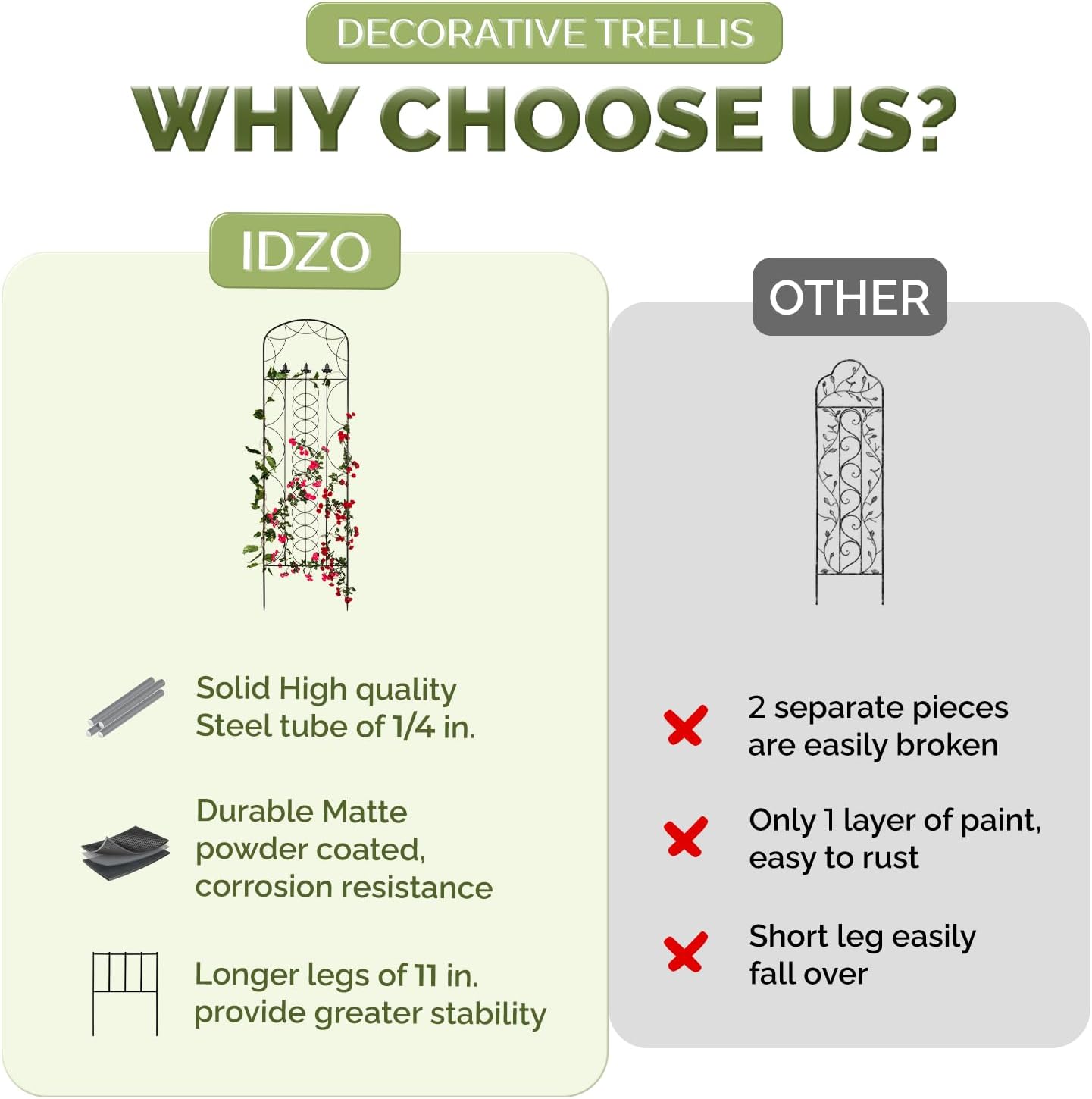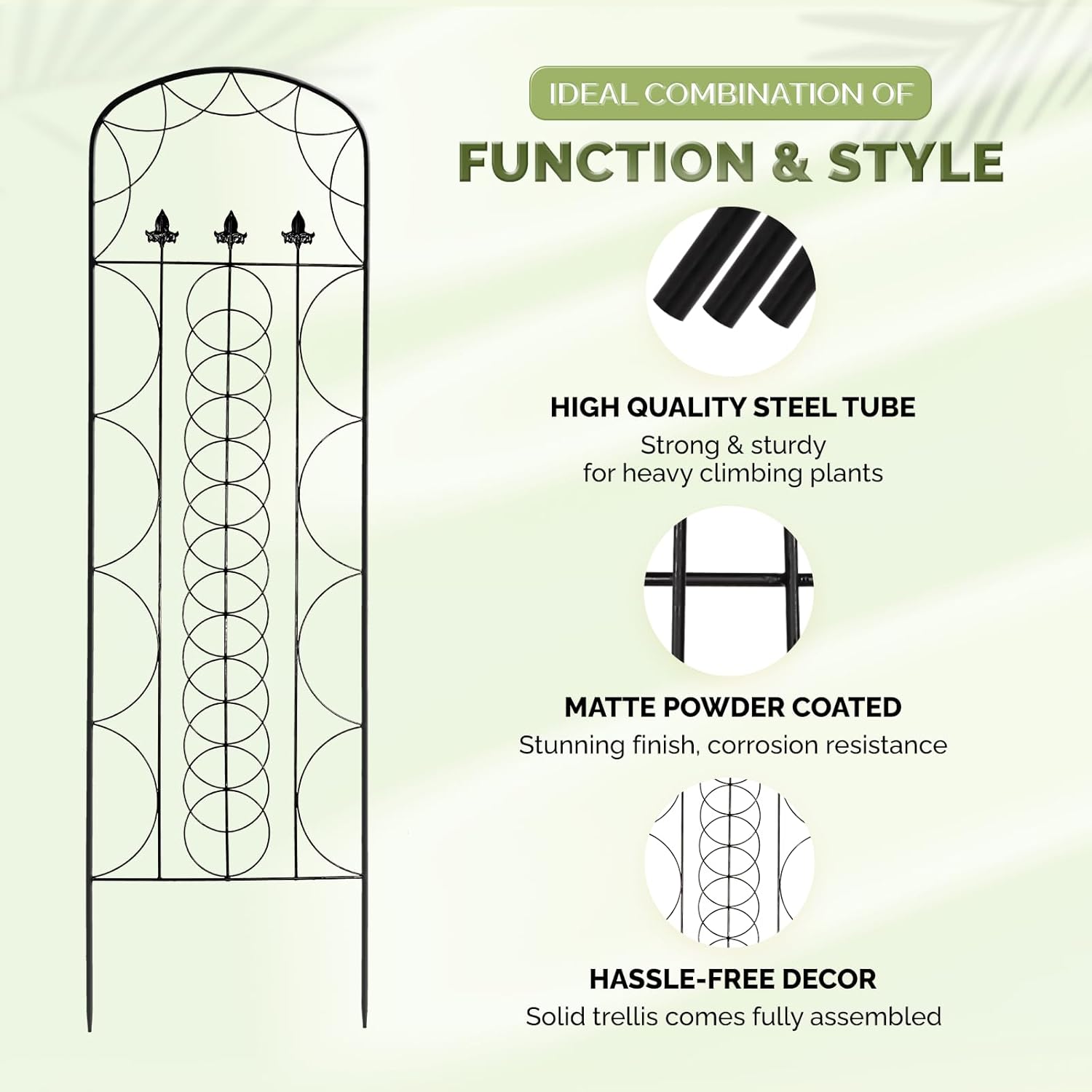 - 🎍 BUILT FOR LONG LASTING BEAUTY: The high quality steel trellis for climbing plants with outstanding strength and durability provides solid support for climbing plants; Its powder coating protects it from rust and corrosion, ideal for outdoor use