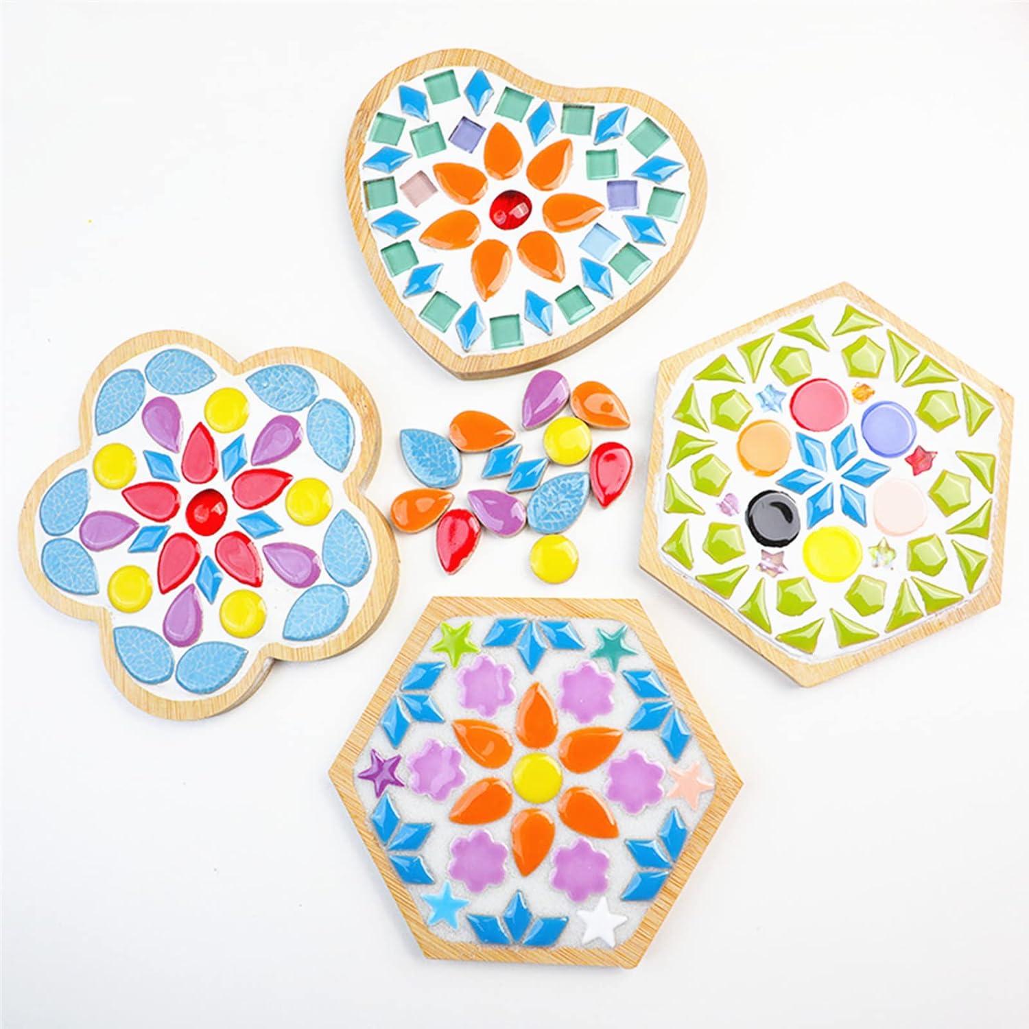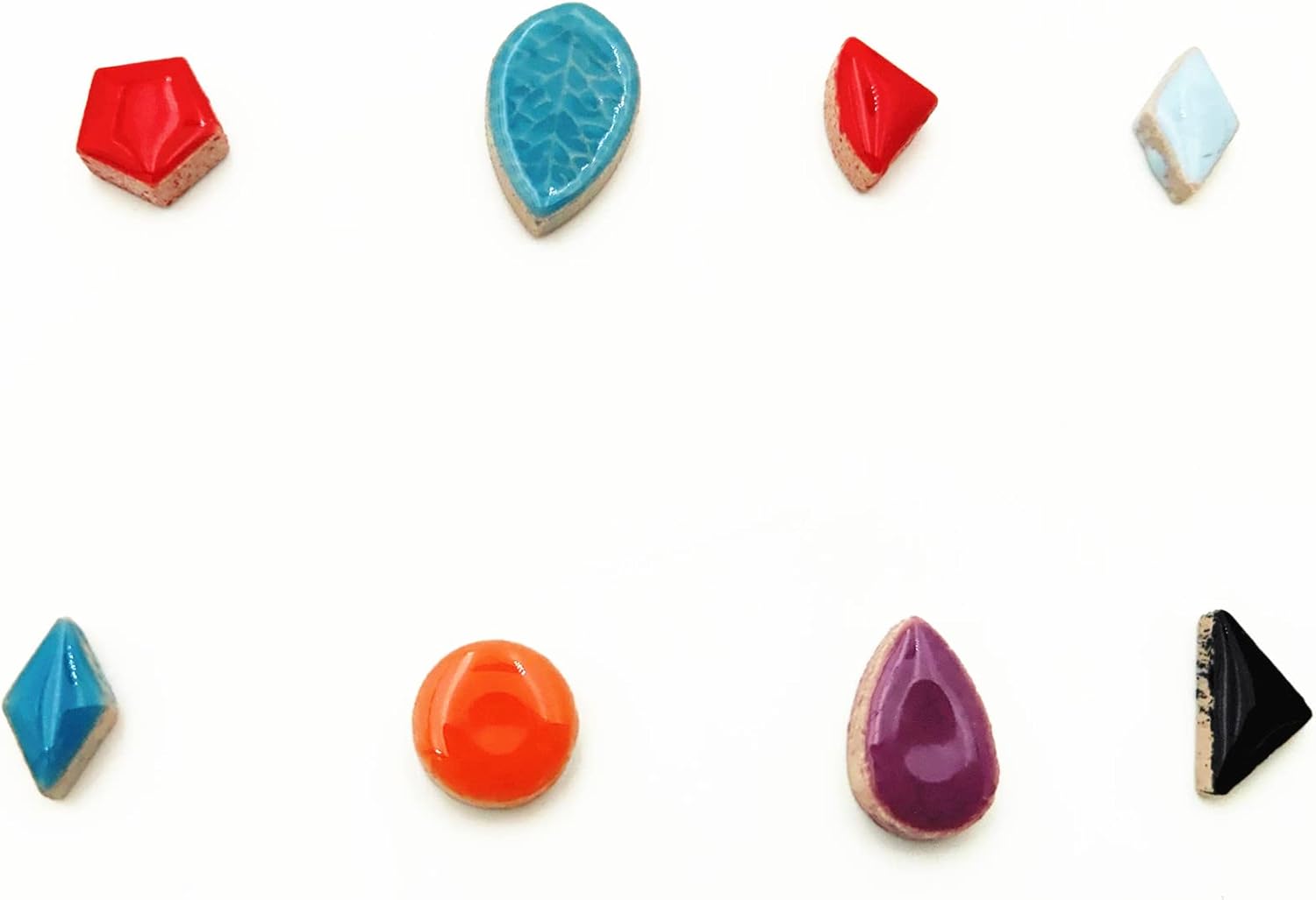 - 8 Size: Roud:0.55*0.55*0.2";Pentagon:0.51"*0.51"*0.2";Raindrops:0.47"*0.75"*0.2";Diamond::0.35"*0.59"*0.16";Sector:0.4"*0.4"*0.2";Triangles:0.47"*0.63"*0.16";Semicircle:0.71"*0.4"*0.2";Leaves:0.55"*0.87"*0.2";The mosaic tiles are packed in a PP bag about 210pcs