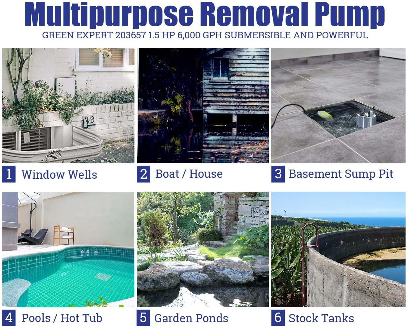 Green Expert 1.5HP Submersible Sump Pump 6000GPH High Flow Full 304 Stainless Steel with tethered Float Switch for Automatically Water Draining in Flooded Basement Pit Sewage Sink Pool Hot Tub