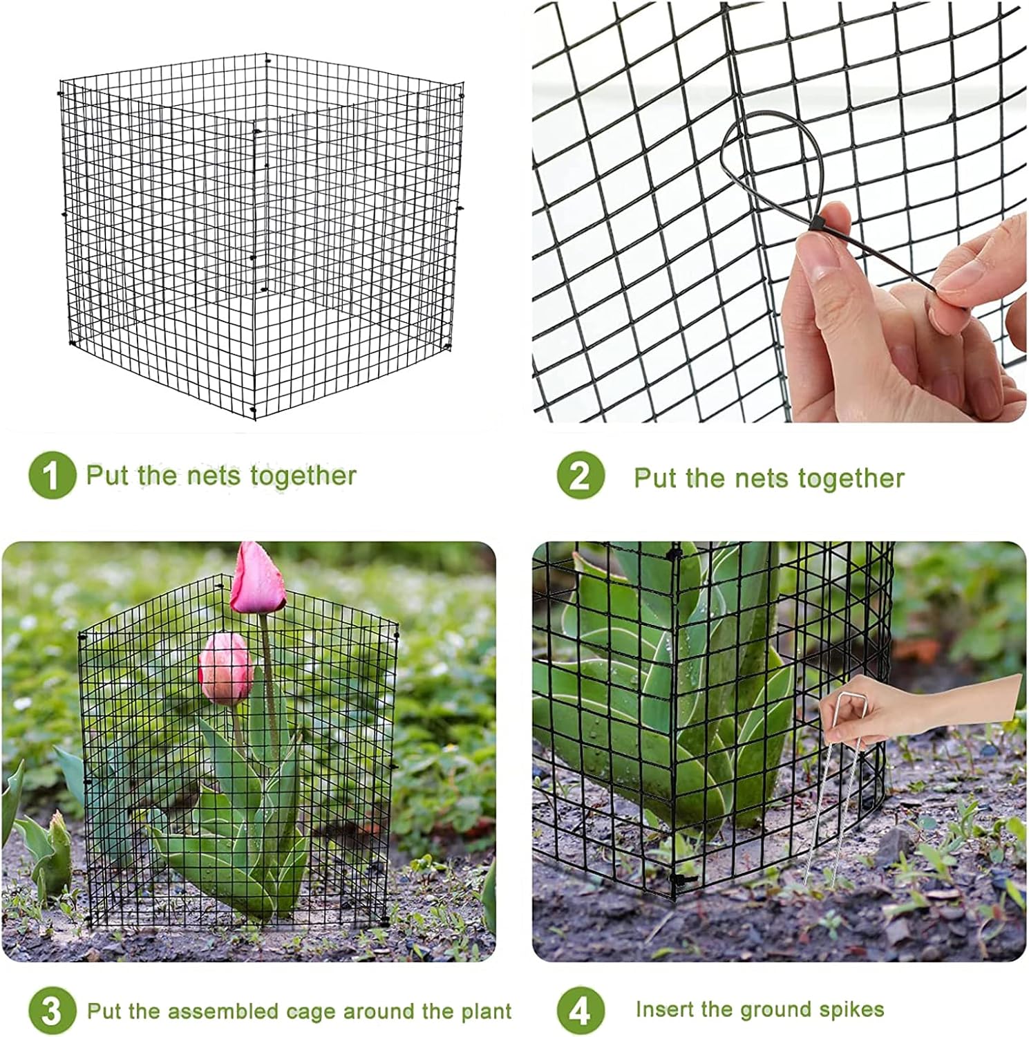 - 【RANDOM ASSEMBLY】Wire mesh plant cages are easy to assemble, you can use nylon ties and ground nails to assemble them into a larger size cage, as the top and bottom cover,and the provided nylon ties can firmly fix them together, then you can use U shaped garden stakes to fix them on the ground to improve stability.