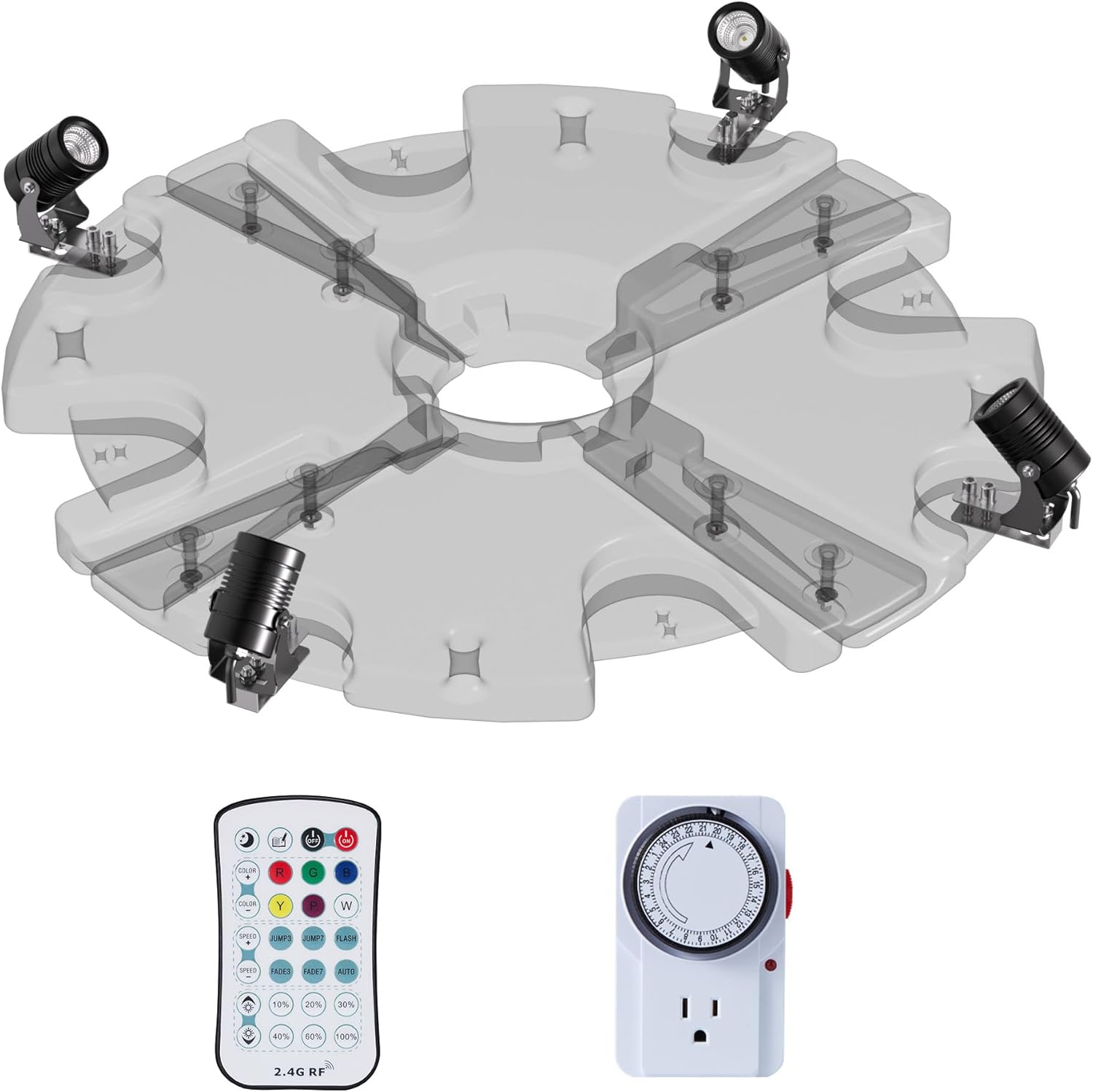 - RGB Color-Changing LED Fountain Light Sets. One remote control and one outlet timer included.