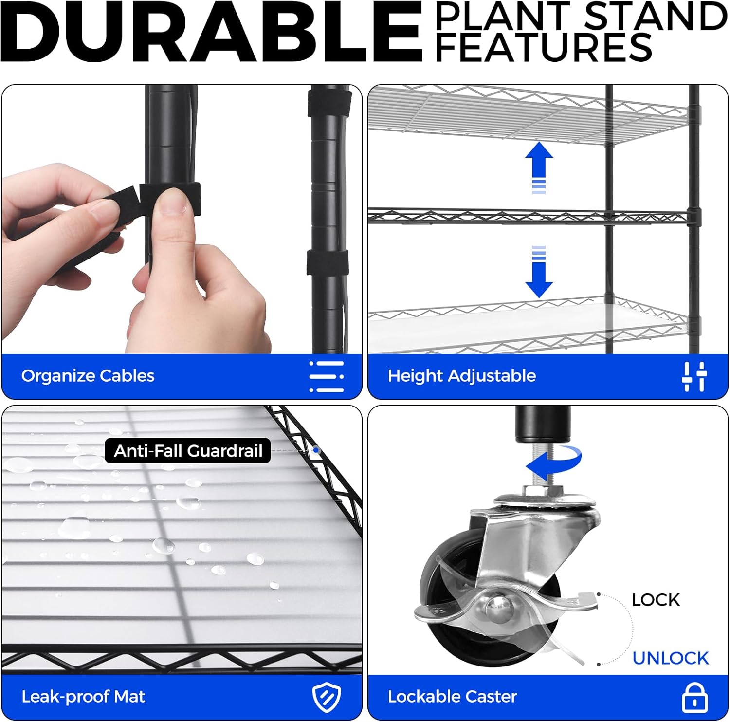 - 5000K Full Spectrum Grow Light & Timer: The metal plant stand comes with 8pcs of 1.6ft T5 LED Grow Lights to meet your plants' requirements in all growth stages. Each plant light is equipped with reflectors for enhanced efficiency, promoting plant growth, and eye protection. Additionally, the mechanical timer can be programmed to repeat your daily schedule based on your preferences