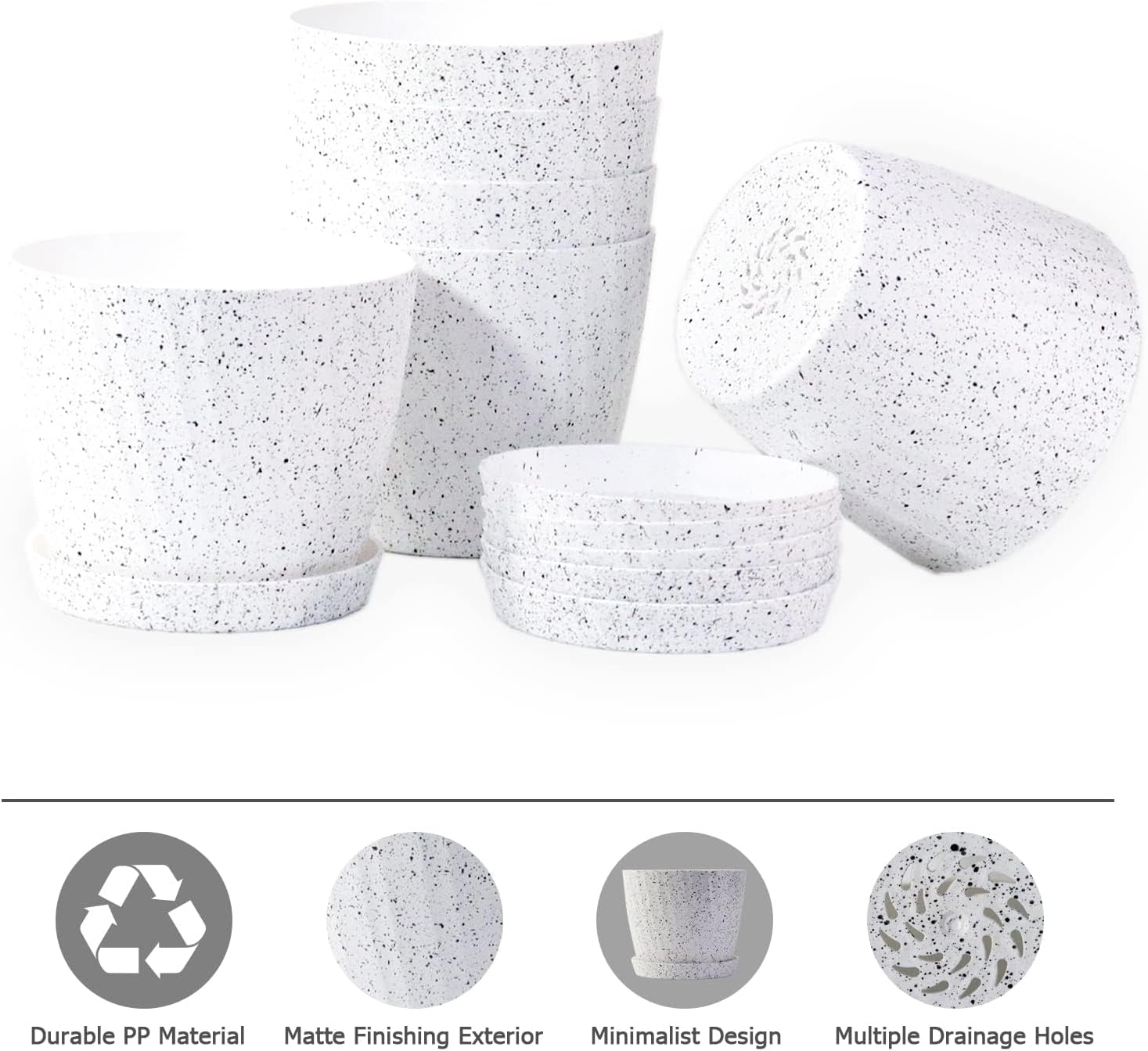 7 Inch Plant Pots Bulk, 6 Pack Plastic Planters with Drainage Holes and Saucers for Indoor Outdoor House Plants and Flowers, White Speckles