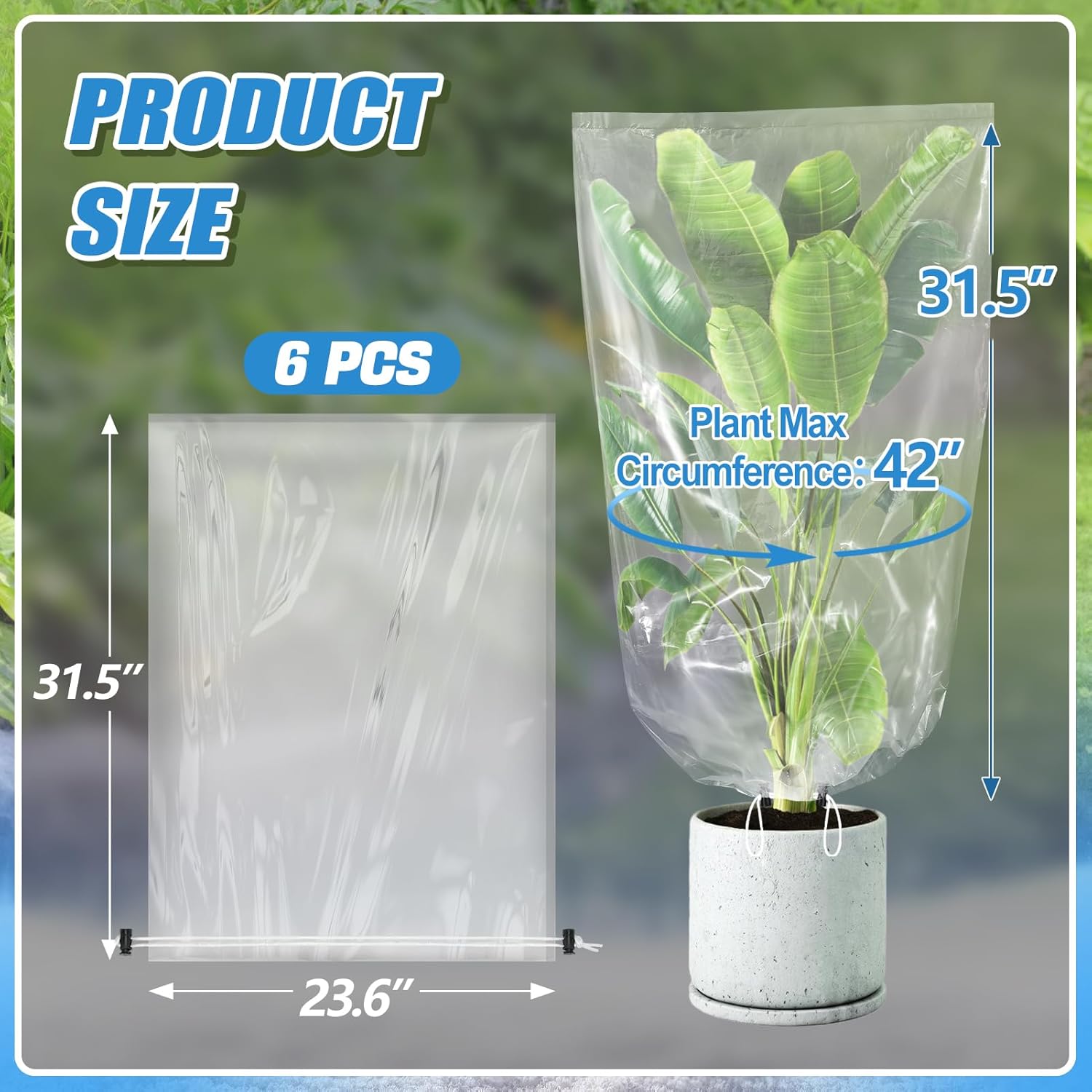 ANPHSIN 6 Pcs Winter Plant Cover Freeze Protection - 23.6" x 31.5" Plastic Plant Frost Bags with Drawstring, Transparent Waterproof Plant Shelter Coverings for Outdoors Garden Potted Plants