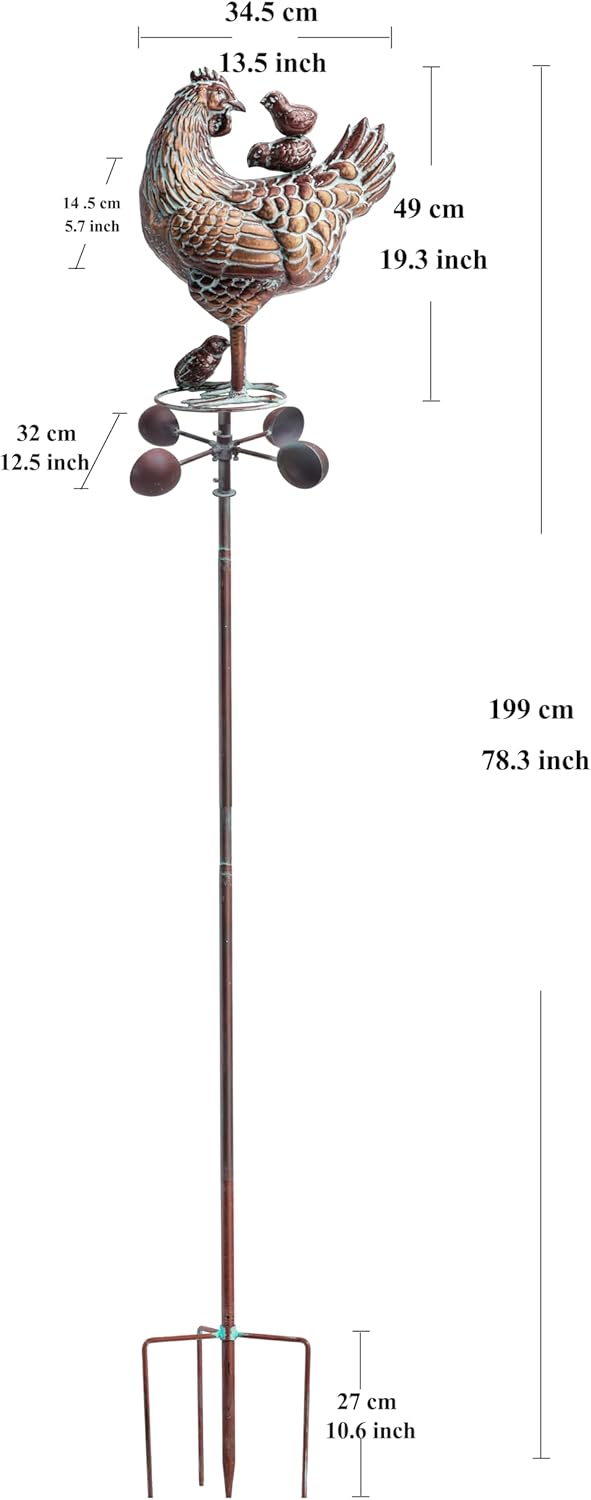 - Metal Chicken Hen and Chicks Wind Spinner for Yard and Garden - The chicken sculpture garden stake measures 78" H x 13.5" L x 12.5" W. This vintage-style vintage metal chicken decoration not only enhances your gardening decor but also serves as a conversation starter, making it a unique addition to outdoor. Perfect decorative accent piece to enhance rustic, country, or farmhouse style outdoor interiors