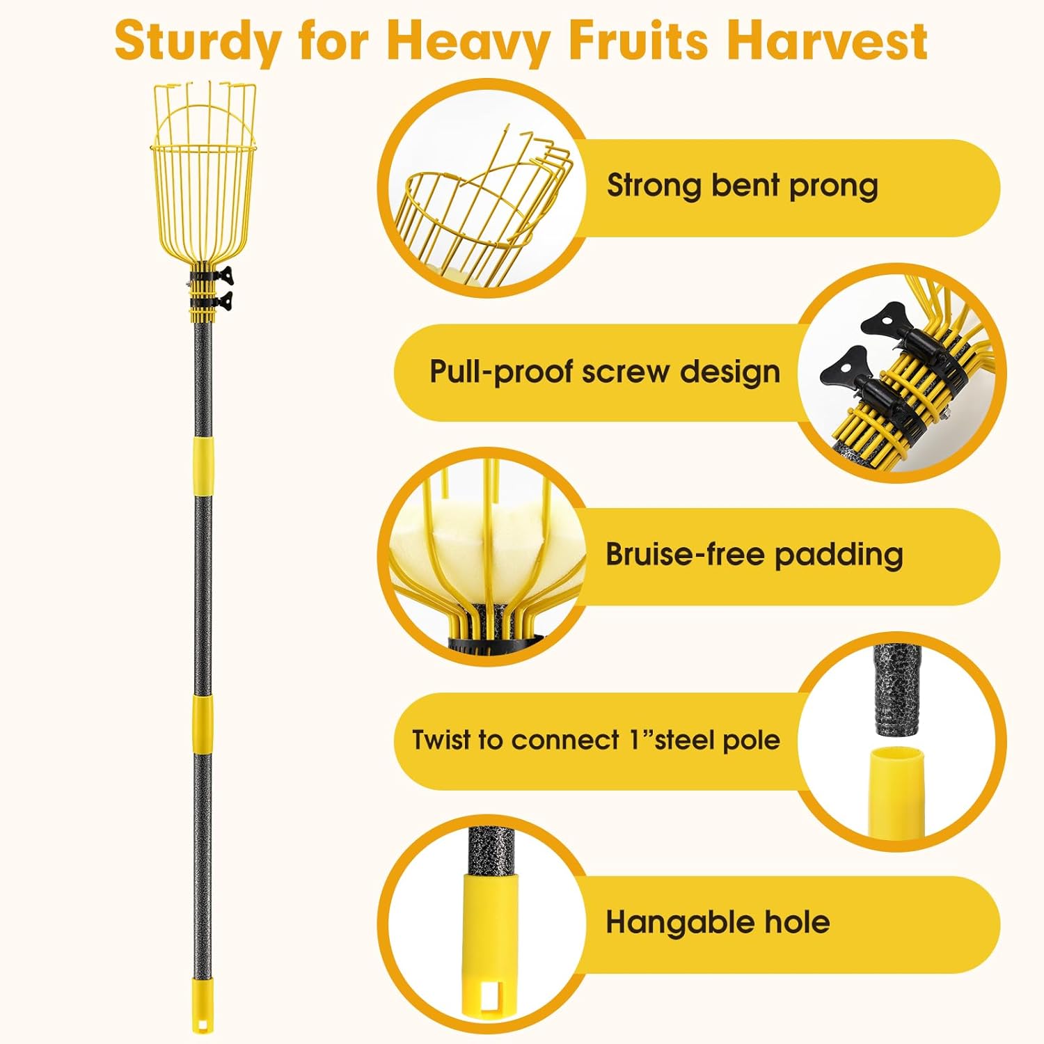 - Fruit Picker Pole with Basket: The package includes a long pole in several sections, a basket,a pad and a bag. Ideal for harvesting a variety of fruits like apples, mangoes, lemons, oranges, avocados, persimmons, and more