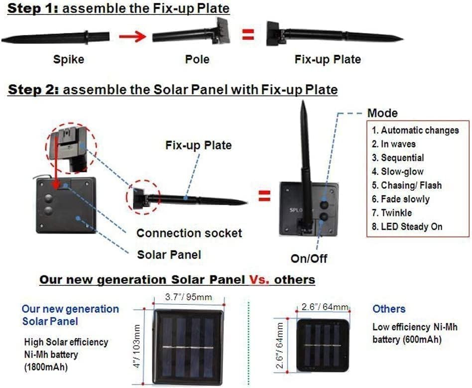 - Long working time - With a full charge of 6-8 hours, the fairy lights will provide lighting for 8-10 hours.Manganese element are added into the SPLOcolor Tech Solar Light Batteries to ensure that solar battery can be charged in the Four seasons。