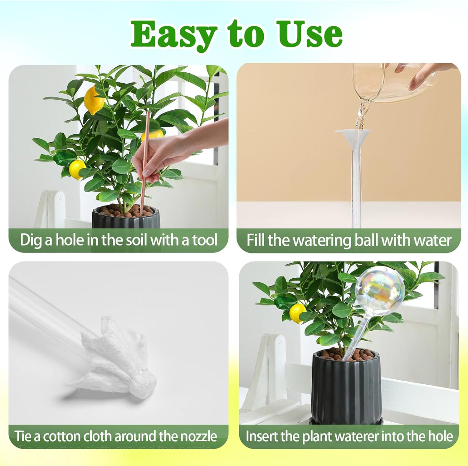 - Easy to Use: 1: Dig a hole in the soil; 2: Fill the watering ball with water; 3: Wrap the neck with cheesecloth or cotton and secure with a small rubber band; 4: Insert the plant waterer into the hole; 5: Adjust the water drip rate by adjusting the waterer tilt angle and soil relaxation