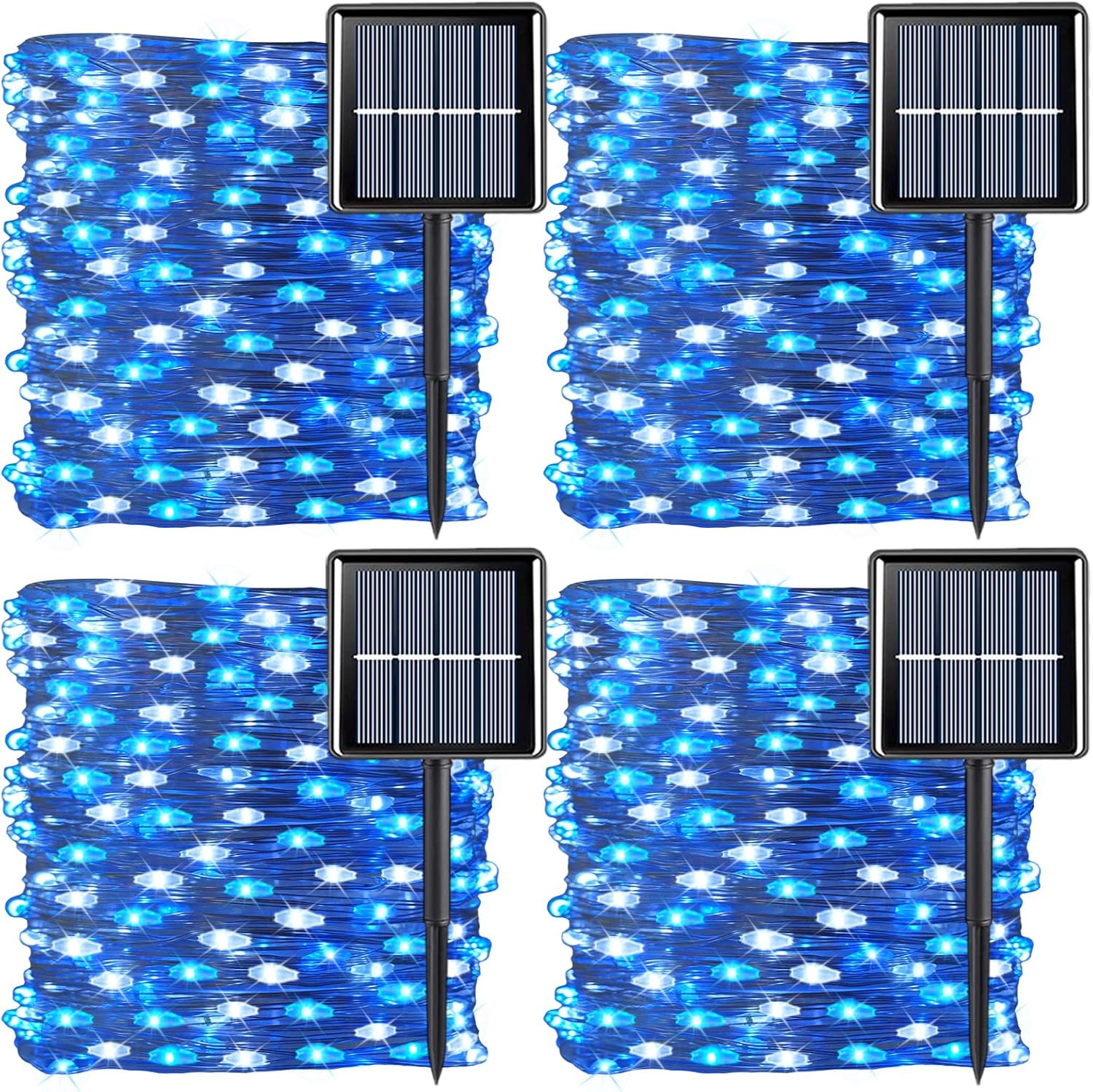 - Brilliant Outdoor Christmas StringDecor: 4 Pack each 100 LED starry-style solar christmas lights with blue and white light accent your space with a unique, inviting glow. Each lights with 33ft length is perfect to put around a garden or porch railing.Blue&White solar lights were the finishing touch for a back yard bbq, party, wreath, fence, patio, pools, bush, holiday, indoor, outdoor. In the dark, the wire fades to invisible, leaving only the fairy lights, create a classy and romantic atmosphere.
