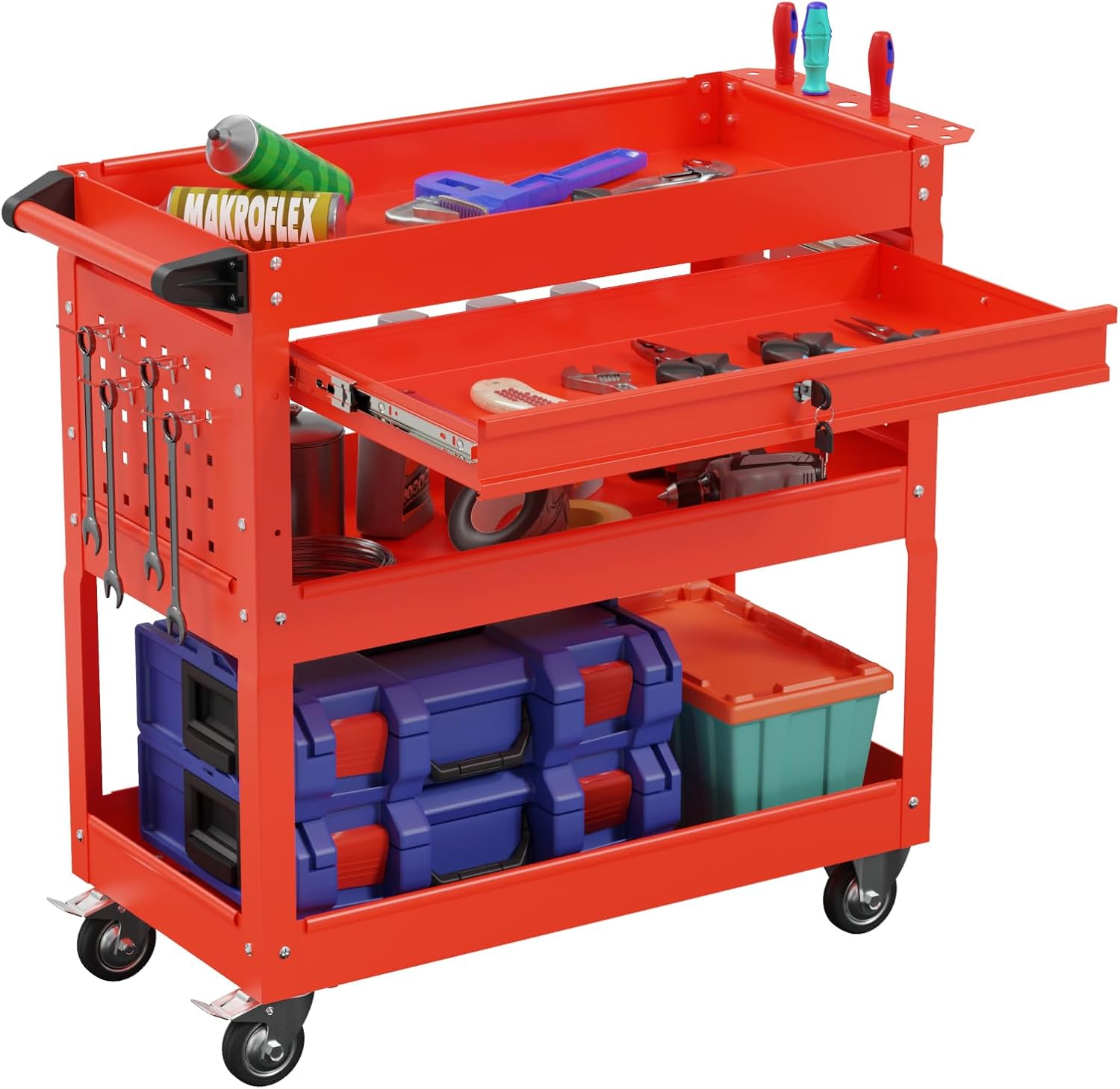 3-Tier Heavy Duty Utility Cart on Wheels, Rolling Tool Cart on Wheels with a Drawer, 350 Lbs Load Capacity Rolling Tool Storage Organizer for Garage, Warehouse and Repair Shop(Red)