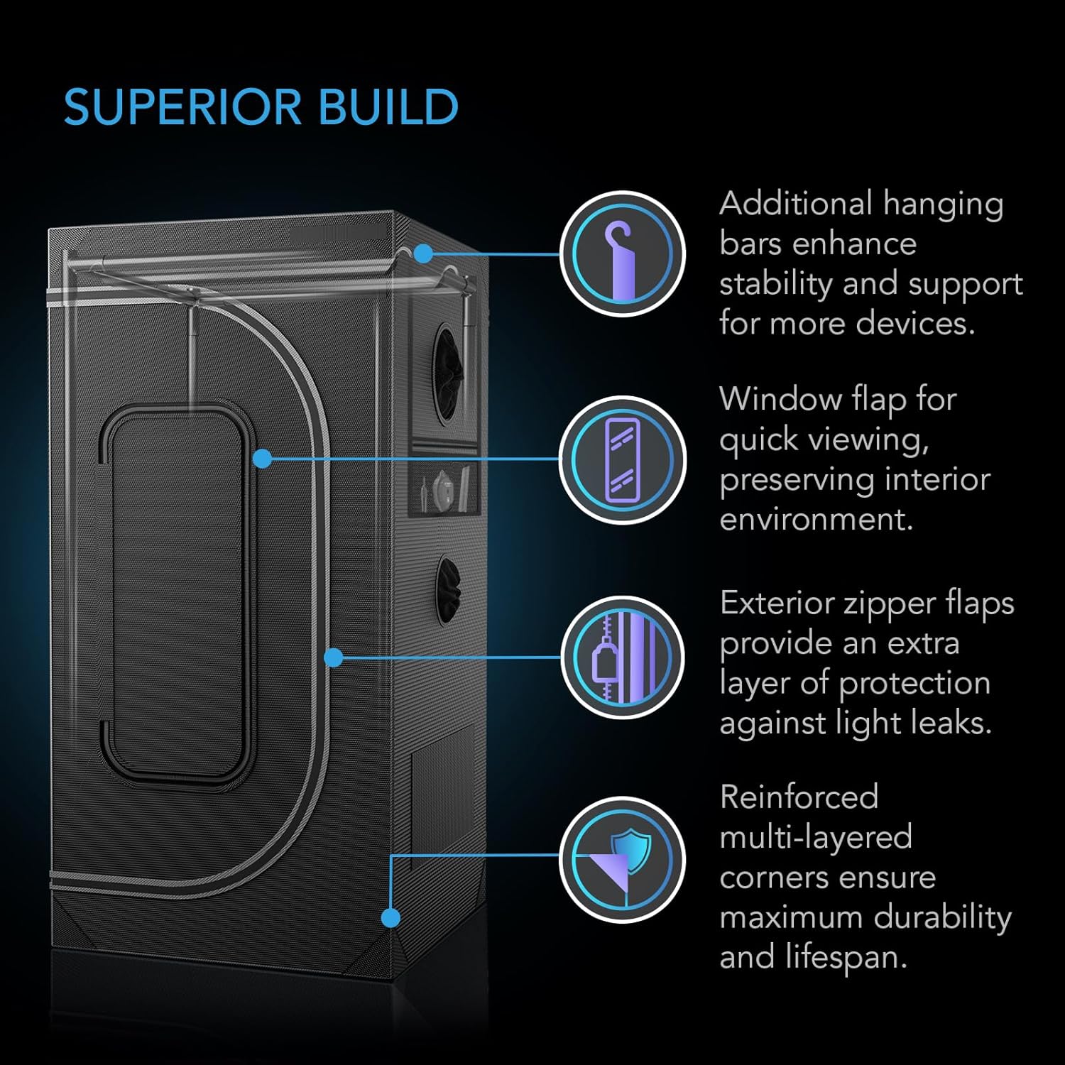 - Advanced grow tent designed with lab-tested reflective mylar for maximum light efficiency, taller windows for clear visibility, and enhanced light-blocking technology.