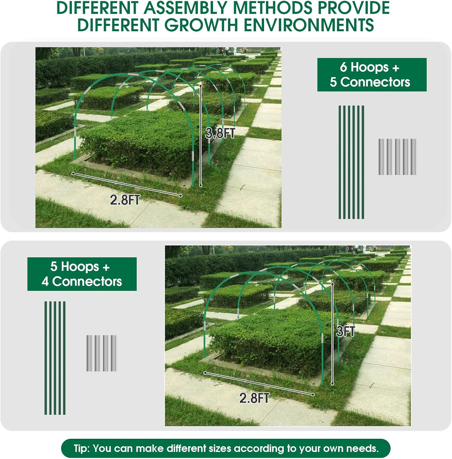 - 【Easily Assemble】No tools required! Simply combine 8 or more hoops with connectors, bend the assembled hoops and insert them into the soil, Then just secure the greenhouse covering with clips. You can make a suitable growing tunnel for your plants according to your needs.