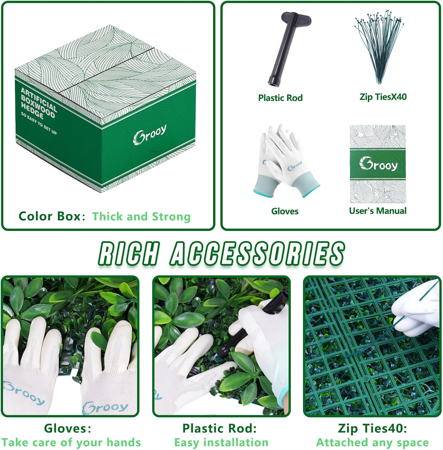 - 🌿【Premium Greenery, Built to Last】Grooy Artificial Boxwood Hedge Panels are made tough, using the latest in High-Density Polyethylene (HDPE). No matter the blazing sun or stormy weather, they'll stay vibrant and lifelike, adding a touch of nature that lasts.
