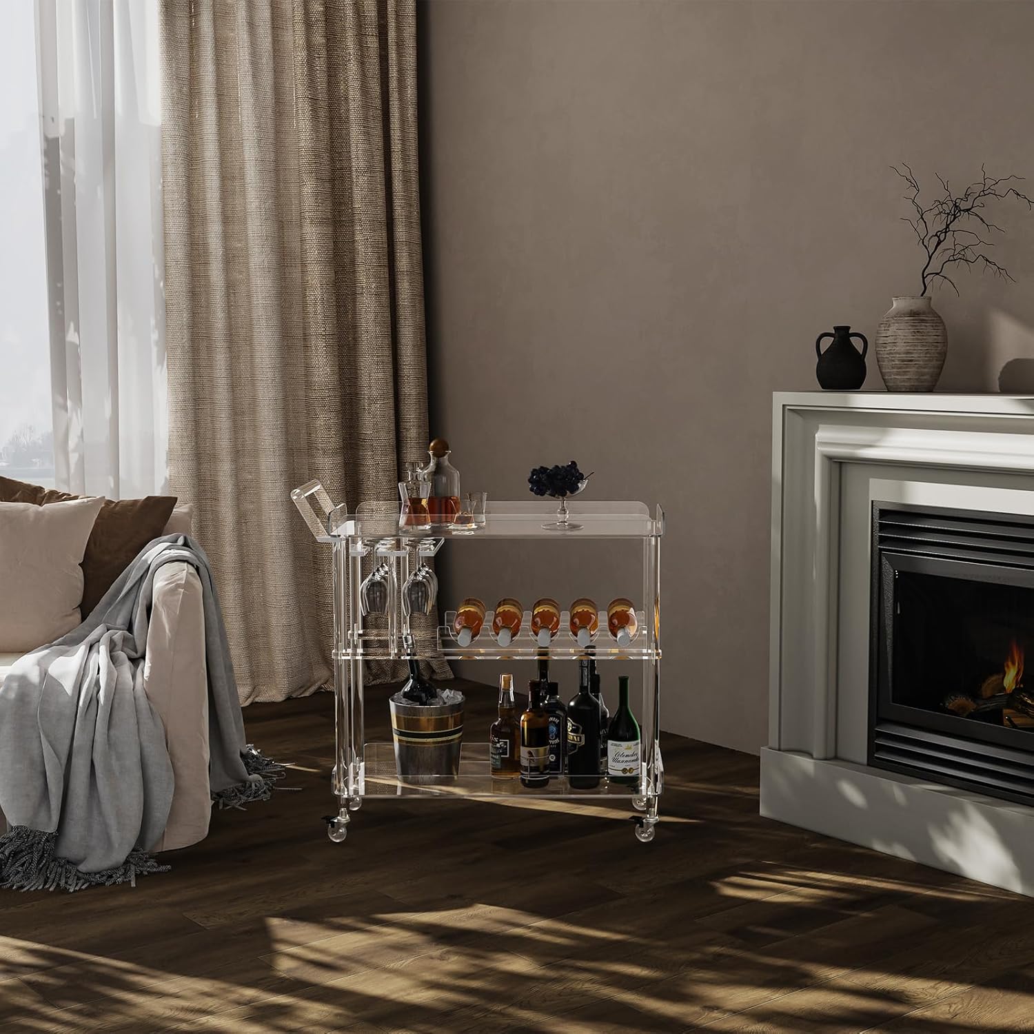 HMYHUM Acrylic Bar Cart with 4 Lockable Wheels, Clear Serving Cart with Wine Rack and Glass Holder, Rolling Beverage Cart for Home, Kitchen, Dinning Room, 33.7" L x 13" W x 34.8" H