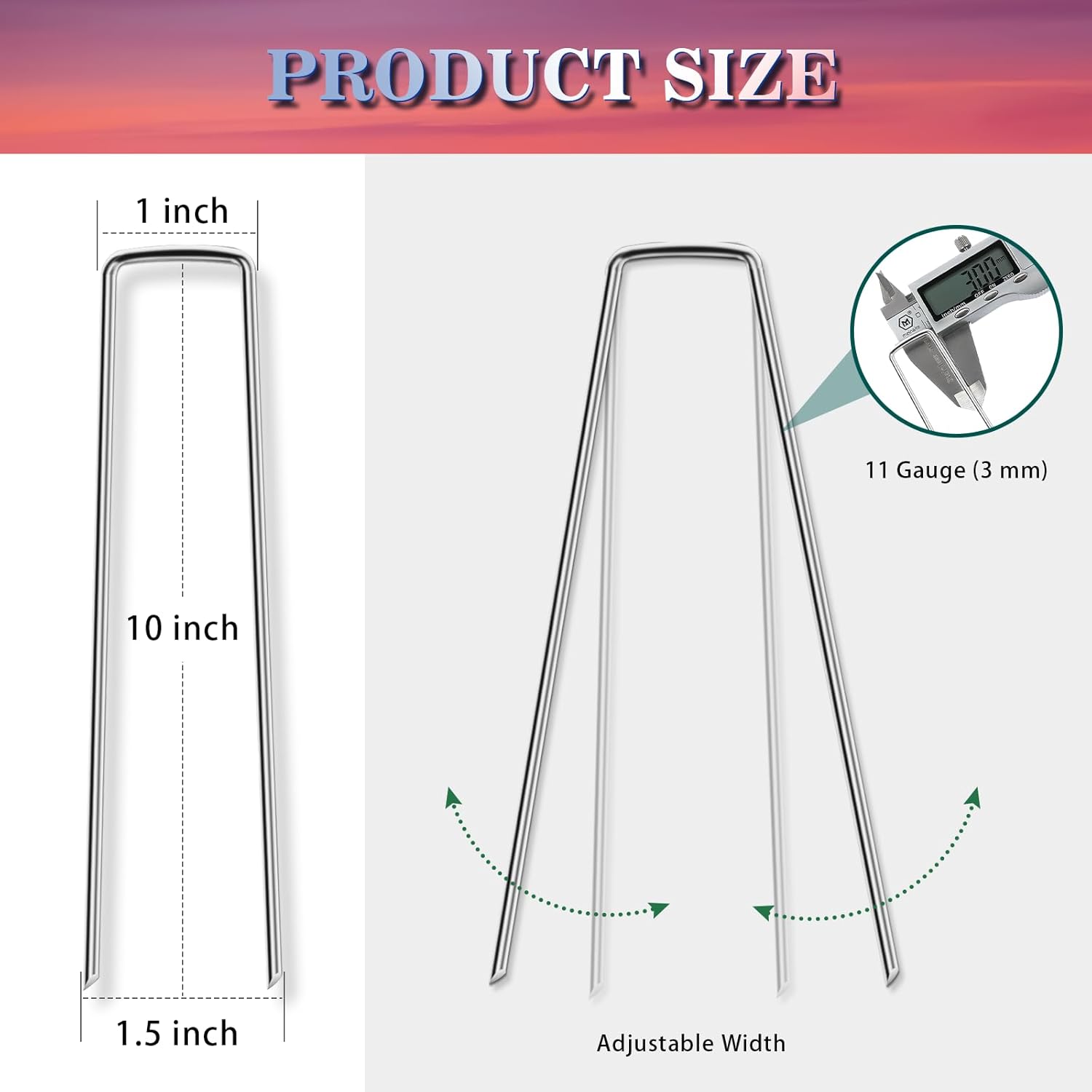 - Package Contains & Size: 50pcs 10 inches galvanized rust-proof u-shaped garden stakes in a sturdy box. The top width is 1 inch, the width below is 1.5 inch, with a wire diameter of 3mm (11 gauge). Specially designed silver white stakes are available for outdoor decor and landscape garden decor