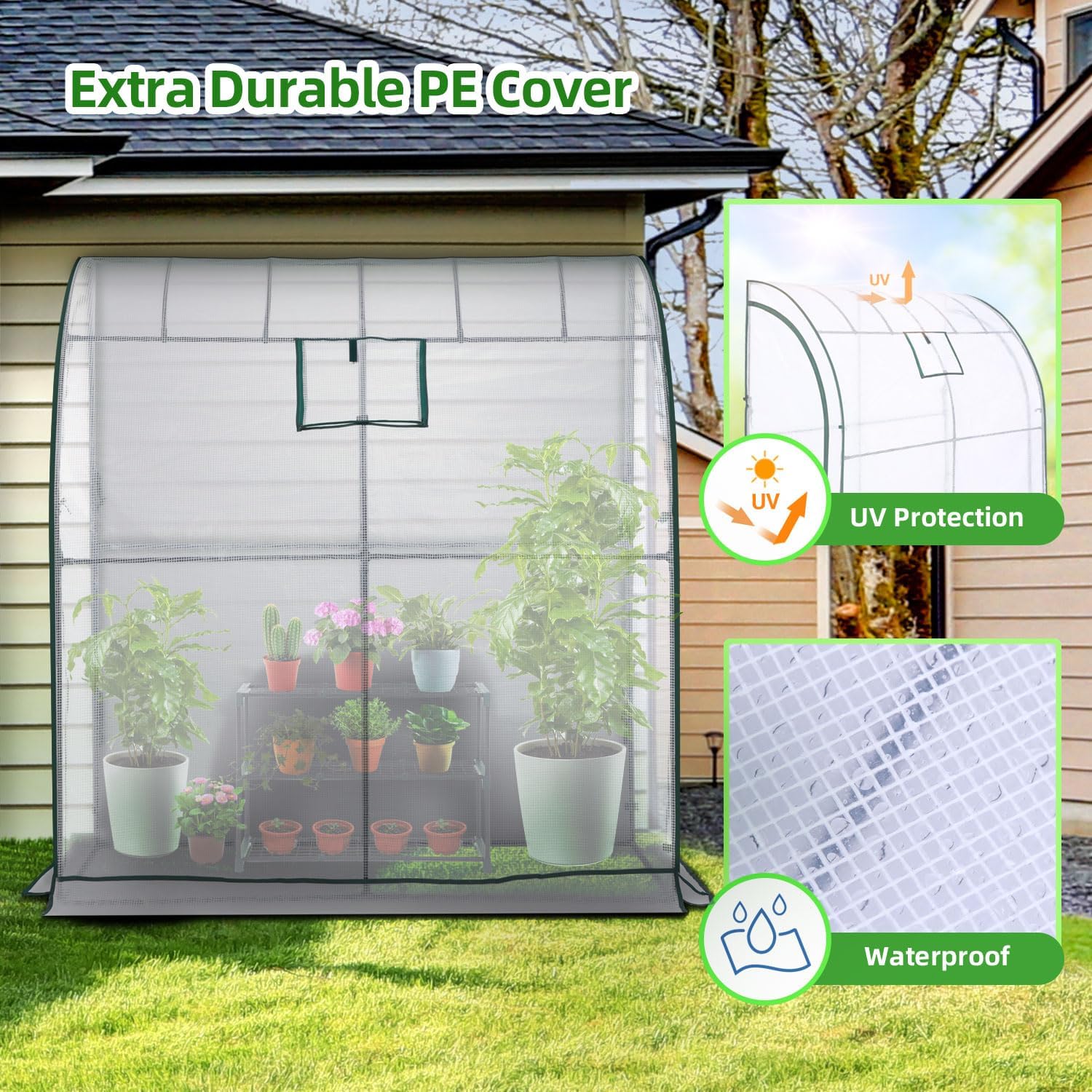 - Lean to Greenhouse: The spacious walk-in greenhouse measures 6.56x3.28x7.05 ft and can conveniently lean on your house wall, barn, garage, or fence for enhanced space utilization. Perfect for an outdoor greenhouse experience