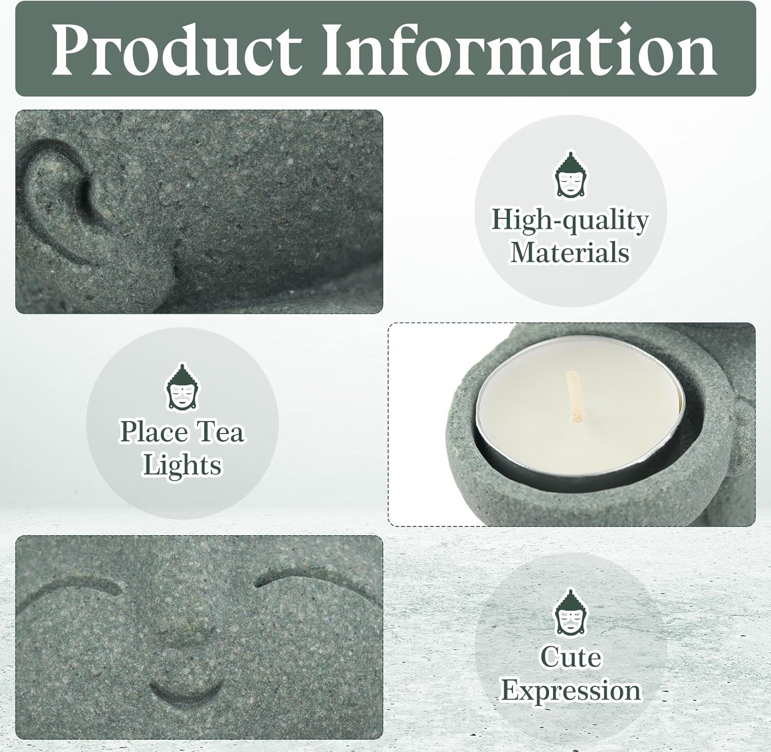 - Appealing Color and Design: the minimalistic gray tone of the baby Buddha tea light holder, coupled with its quaint depiction of a zen monk, enhances its appeal to the viewer; The adorable monk figure further brings calmness and serene ambiance wherever it is placed