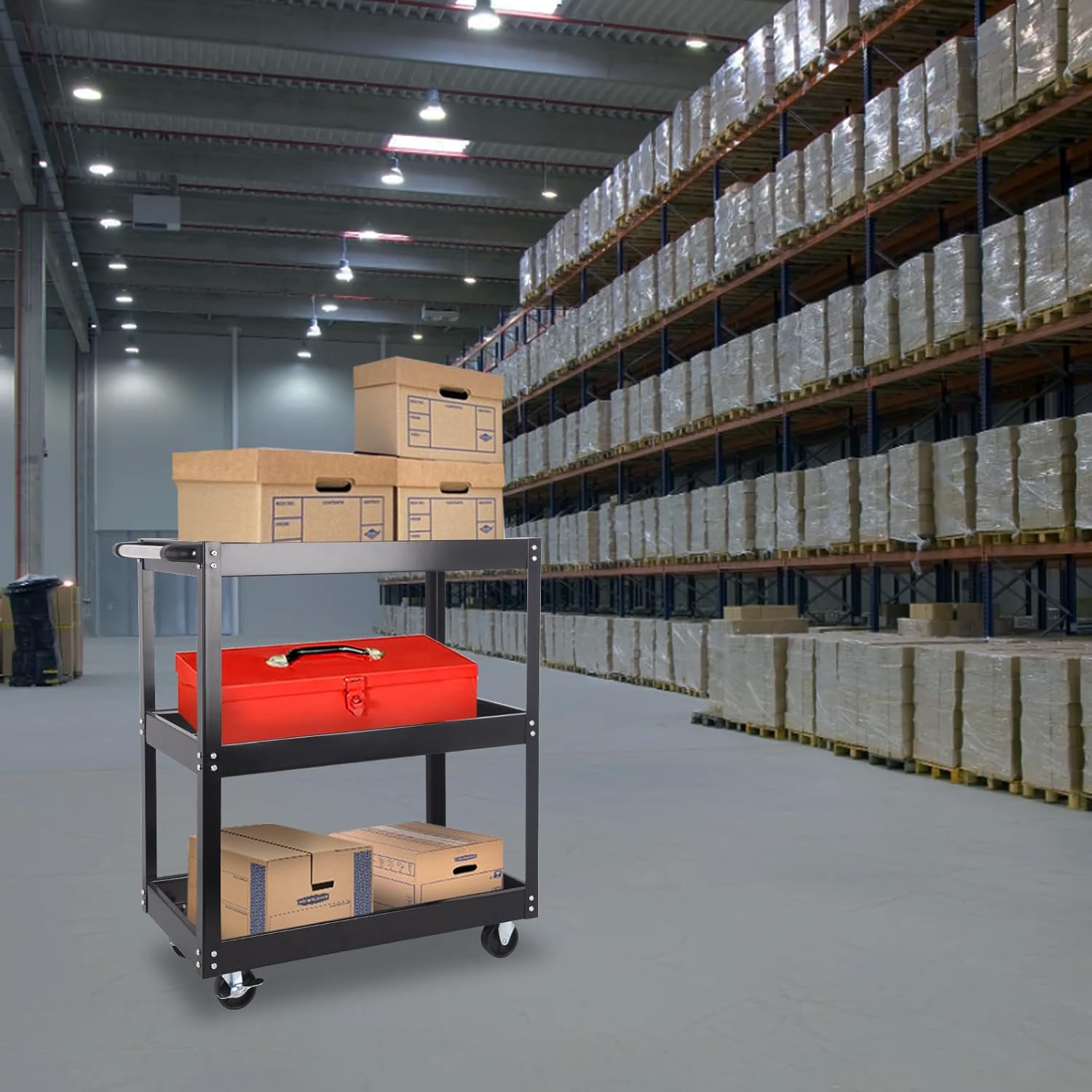 3-Tier Commercial Utility Cart, 3 Shelves Steel Service Tool Cart with Brake Wheels for Mechanics, 330lbs Heavy Duty Rolling Utility Carts Tub Storage Cart for Warehouse Office Garage, Black
