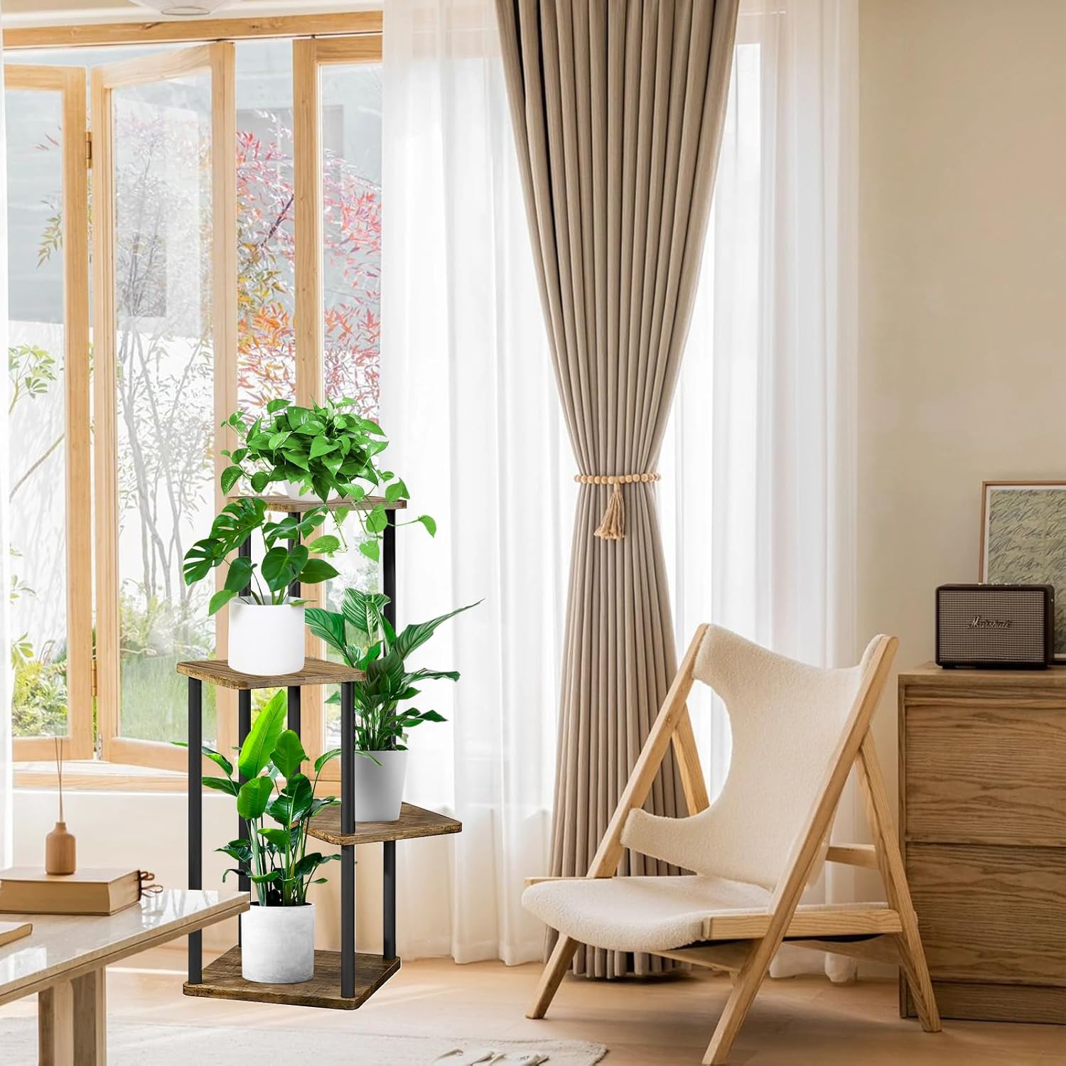 4 Tier Wood Tall Plant Stand Metal Rack Indoor, Multiple Flower Pot Holder Shelves Corner Rack, Planter Shelf Display Rack Storage Organizer for Patio Living Room Balcony Garden(Black)