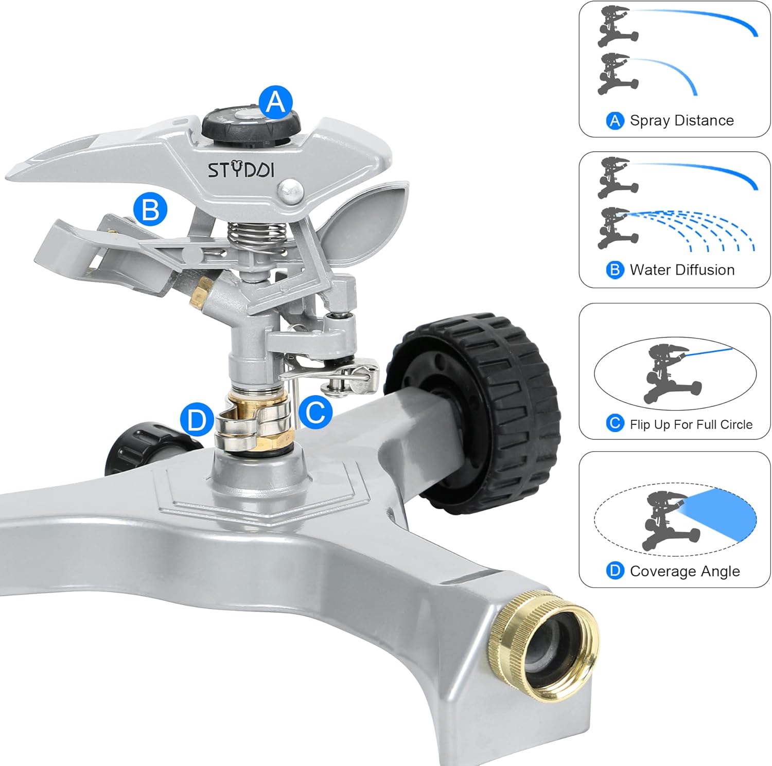 STYDDI Metal Pulsating Sprinkler on in-Series Metal Wheeled Base, Adjustable Circular Water Sprinkler for Medium to Large Circular Lawn, Yard, Garden and Large Areas, Coverage up to 6,360 Sq. ft