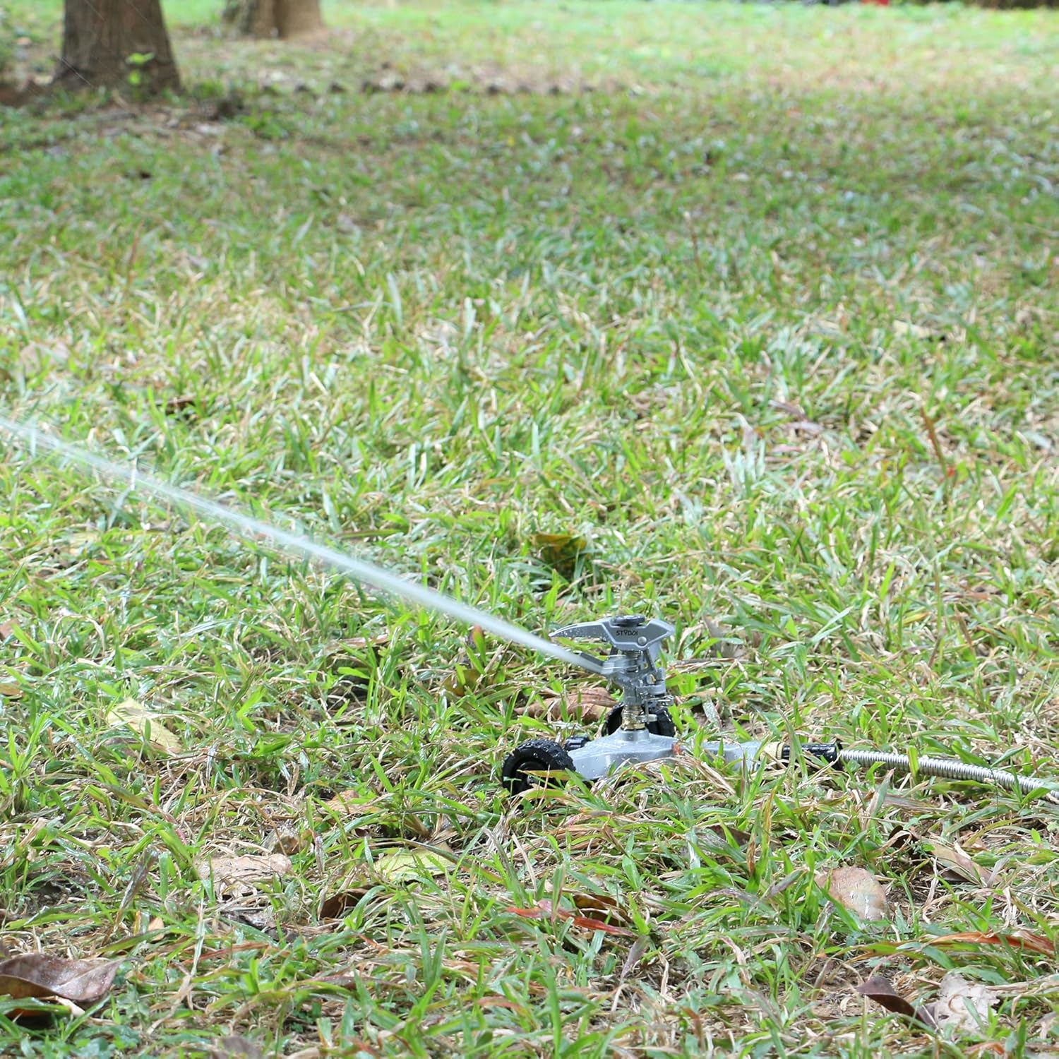 - ALL METAL CONSTRUCTION TO KEEP STABLE - The construction of this impact sprinkler has been upgraded to be all metal making, which is heavy-weight enough to keep the sprinkler in position without rollover when working. Metal is also rust and corrosion resistant, ensuring durability and long-term use. The two large wheels are made of hard plastic that can withstand severe weather conditions and long time exposure.
