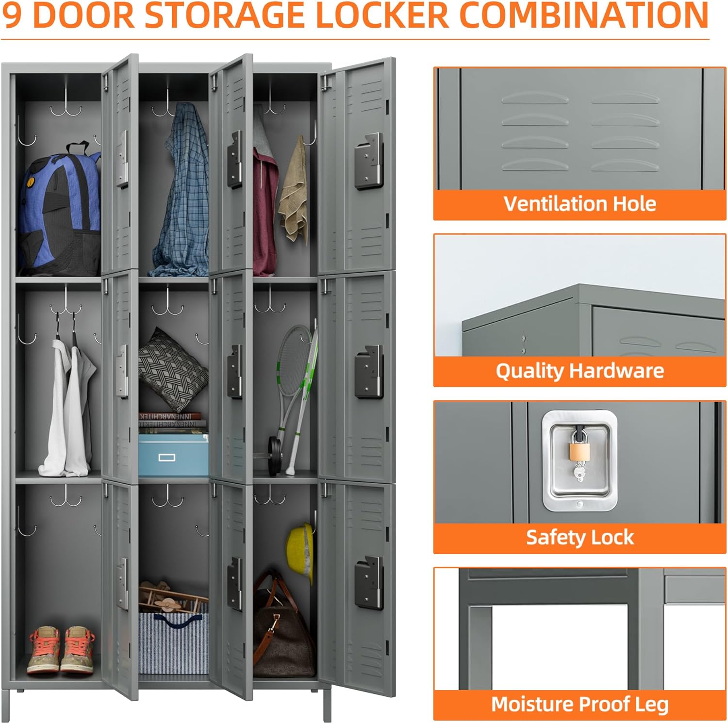 - 【Complimentary Hooks】👏We provide an additional 27 hooks for this 9 door metal locker. There are reserved holes on the 9 doors locker to install hooks for hanging small items such as scarves, hats, keys, bags, etc.