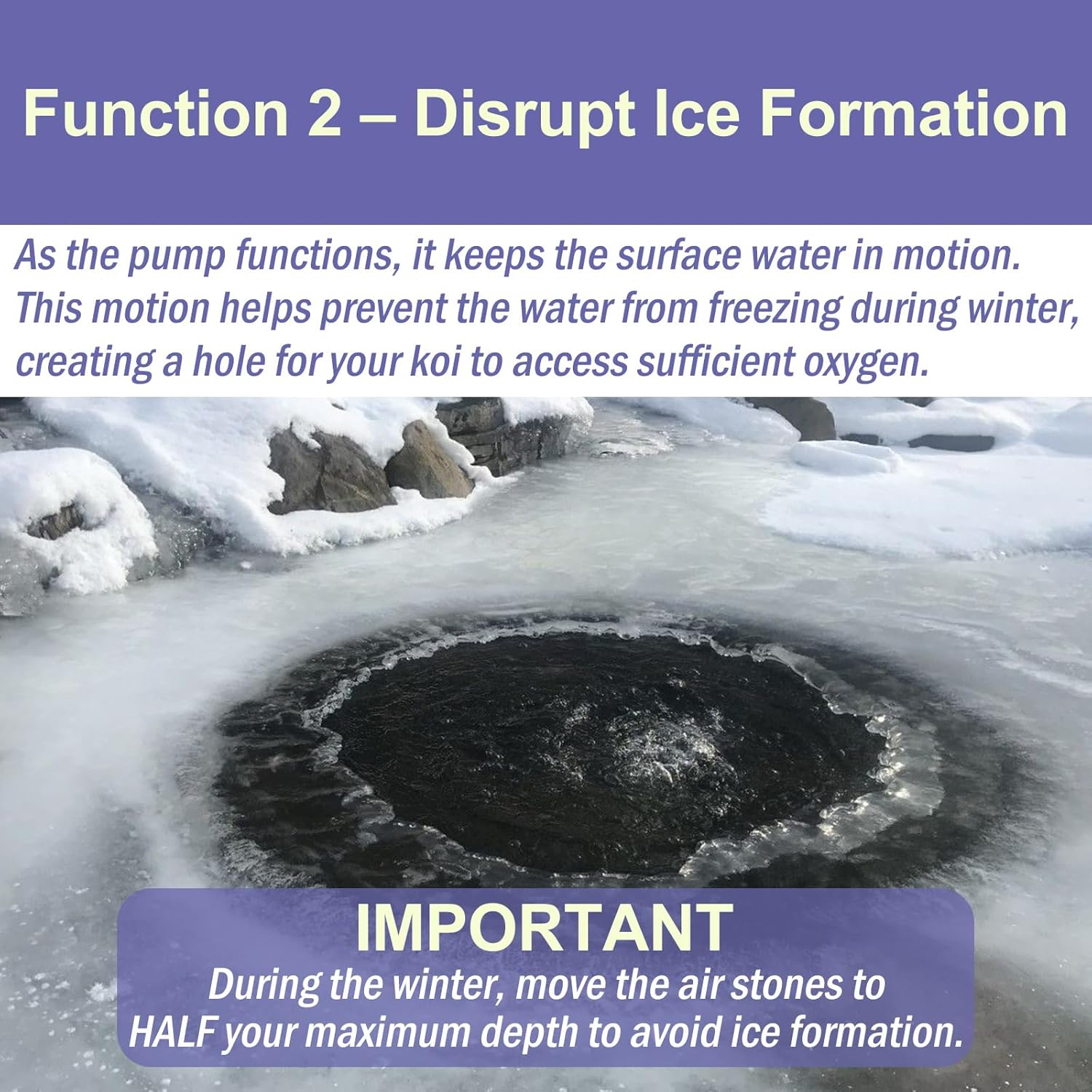 - DUAL-FUNCTIONAL - This versatile pond air pump serves a dual purpose. Not only does it work as a pond aerator, but it also helps prevent ice formation in the cold winter months. By creating a ventilation hole, it allows your koi to breathe and ensures their well-being even in colder temperatures.