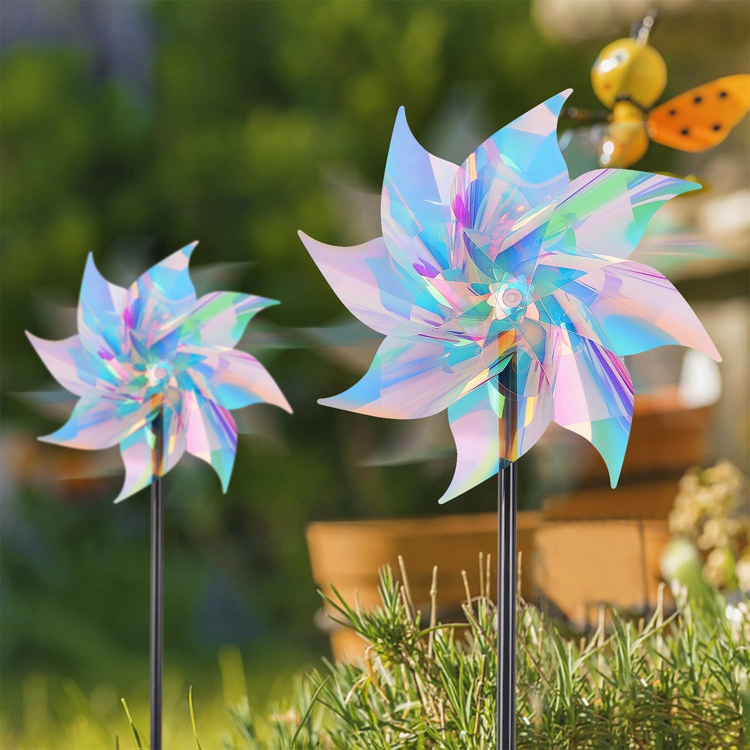 - 10 Pack Transparent Rainbow Reflective Pinwheels: Our visual reflective ornamental pinwheel uses wind motion and light reflections to keep birds away coming from any angle. 10 pack shiny reflective Mylar pinwheels can rotate easily in the breeze, protect your garden, farm, and lawn by creating a bright flash that scares away birds